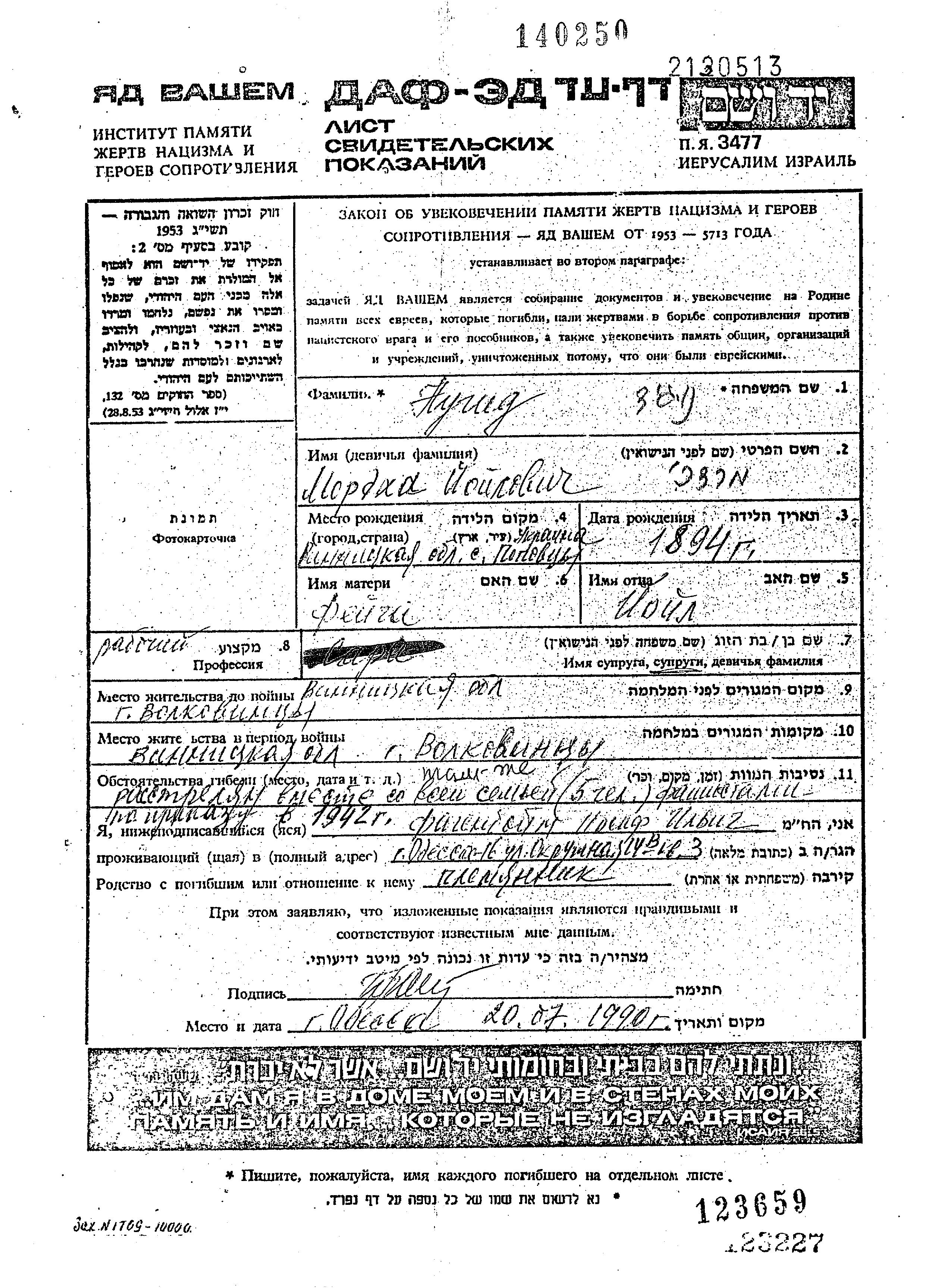 Sara Nugid. Sie war mit Mordekhai Verheiratet. Vor dem Zweiten Weltkrieg lebte sie in Volkovintsy, Ukraine (UdSSR). Während des Krieges war sie in Volkovintsy, Ukraine (UdSSR).