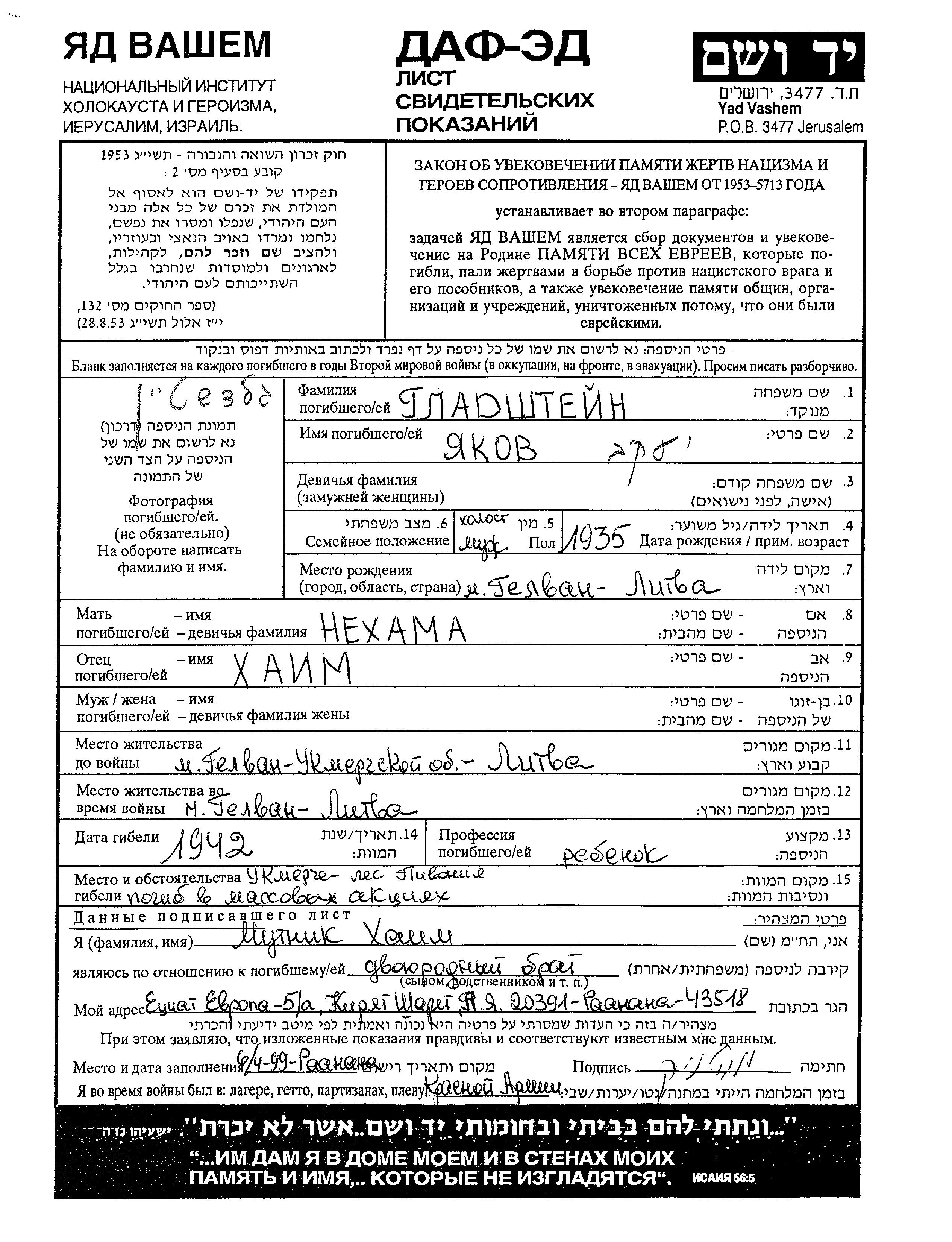Yaakov Gladshtein wurde im Jahr 1935 in Gelvan, Litauen geboren. Er war der Sohn von Khaim und Nekhama. Er war Kind. Vor dem Zweiten Weltkrieg lebte er in Gelvan, Litauen. Während des Krieges war er in Gelvan, Litauen.