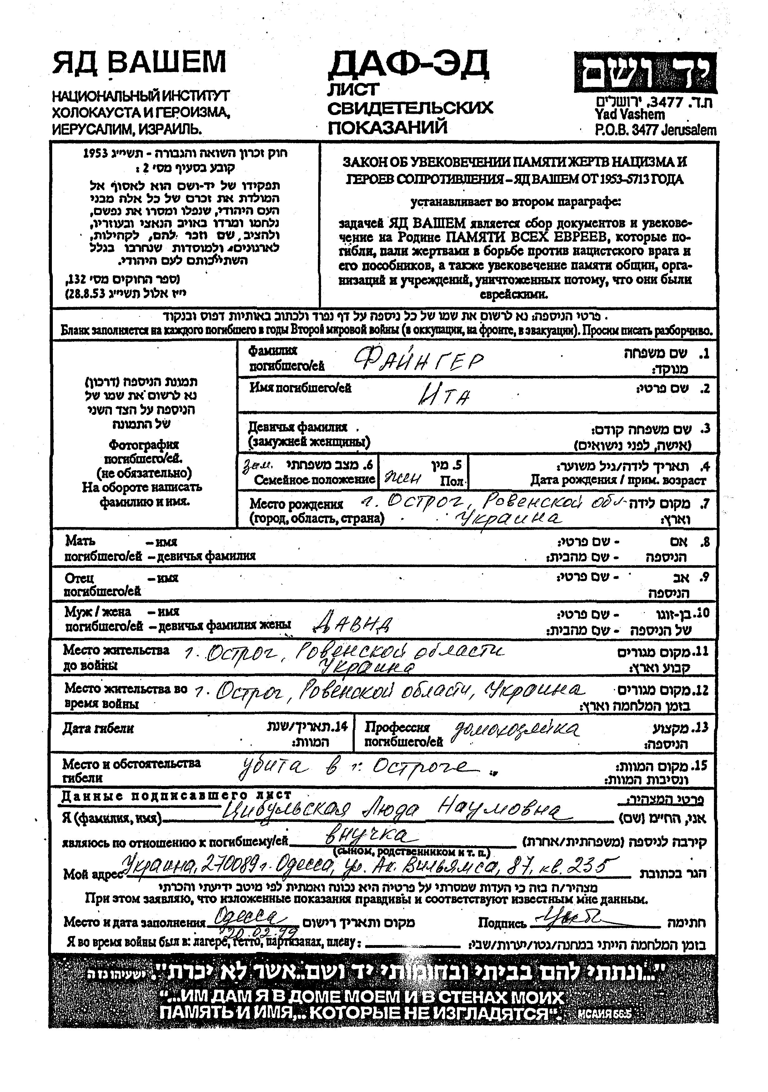 Ita Fainger wurde in Ostrog nad Horyniem, Polen geboren. Sie war Hausfrau und mit David Verheiratet. Vor dem Zweiten Weltkrieg lebte sie in Ostrog nad Horyniem, Polen. Während des Krieges war sie in Ostrog nad Horyniem, Polen.