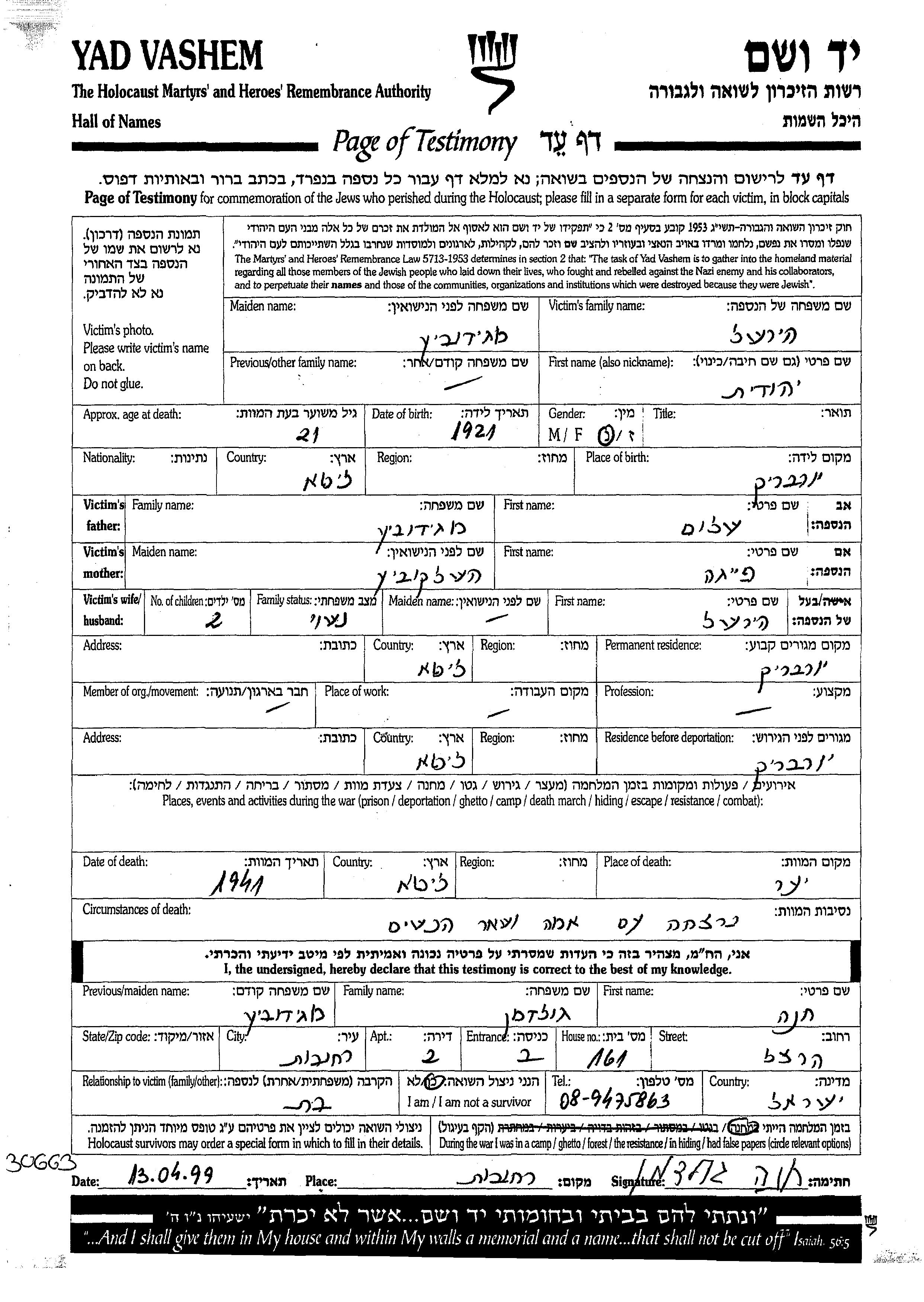 Yehudit wurde in der Schoah ermordet. Todesort: Litauen im Jahr 1941.