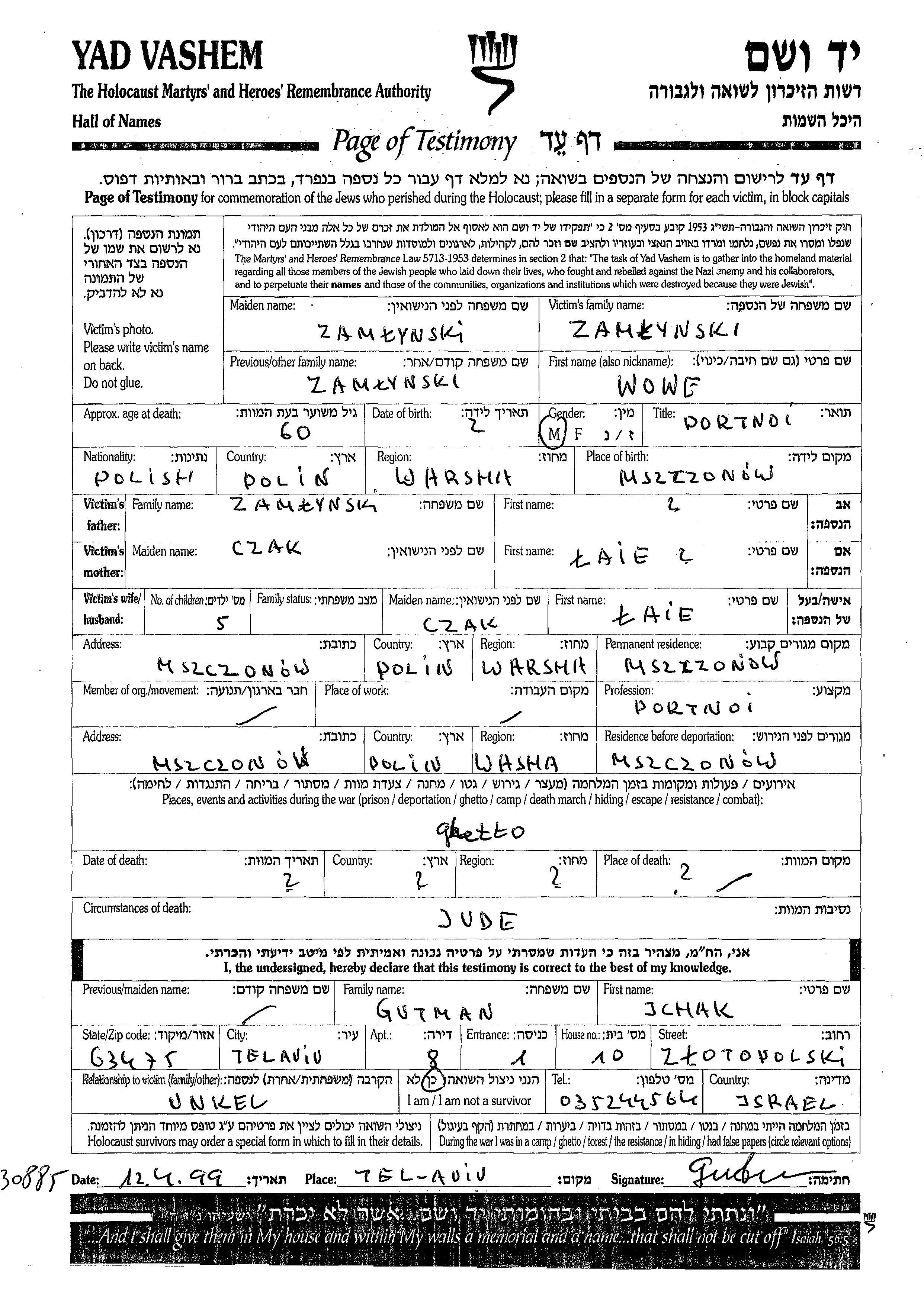 Wowe Zamlynski wurde in Mszczonow, Polen geboren. Er war Schneider. Vor dem Zweiten Weltkrieg lebte er in Mszczonow, Polen. Während des Krieges war er in Mszczonow, Polen.
