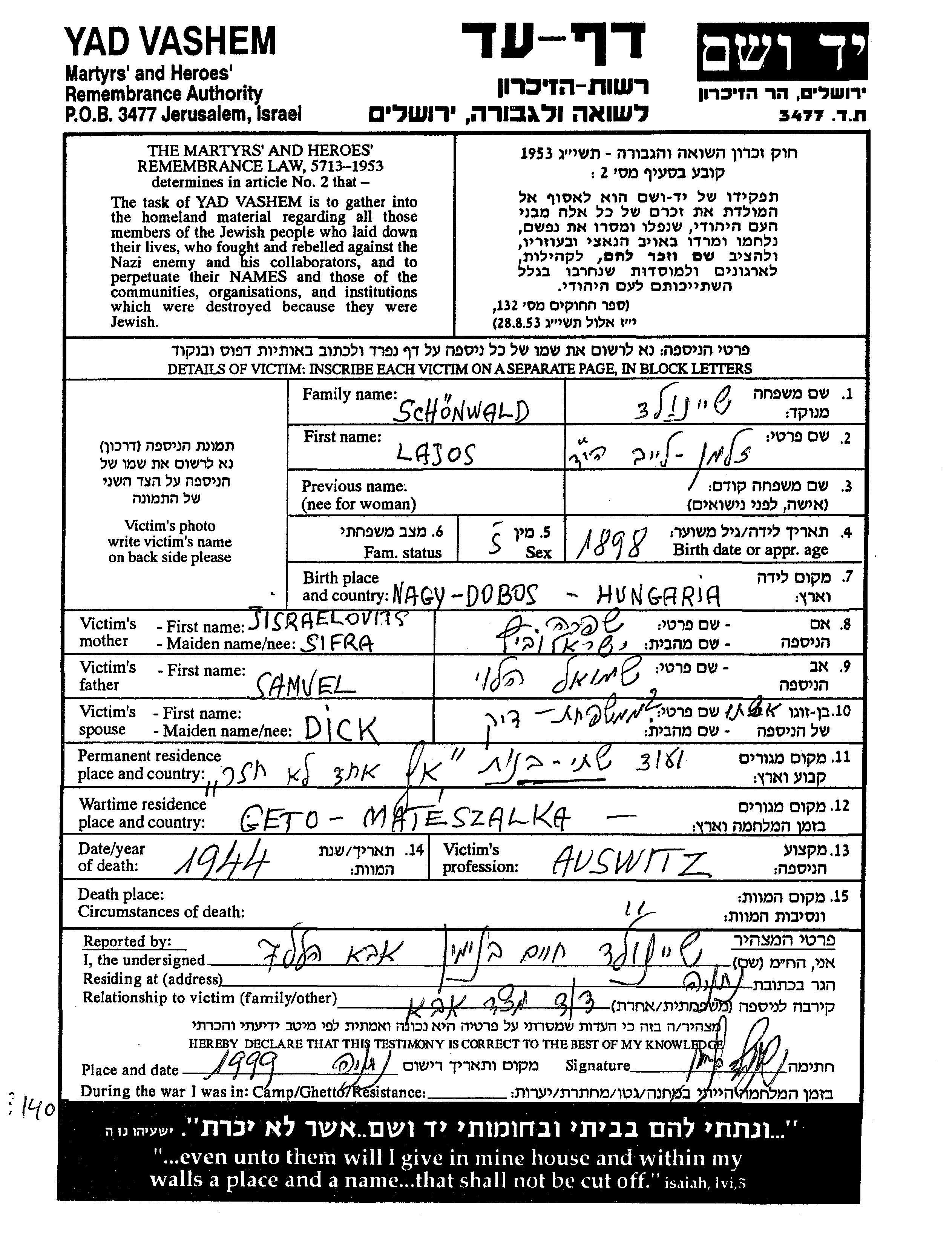 Leib Zalman Lajos Schönwald wurde im Jahr 1898 in Nagydobos, Ungarn geboren. Er war der Sohn von Samuel und Sifra, geb. Jisraelovits. Er war Verheiratet. Während des Krieges war er in Mateszalka, Ungarn.