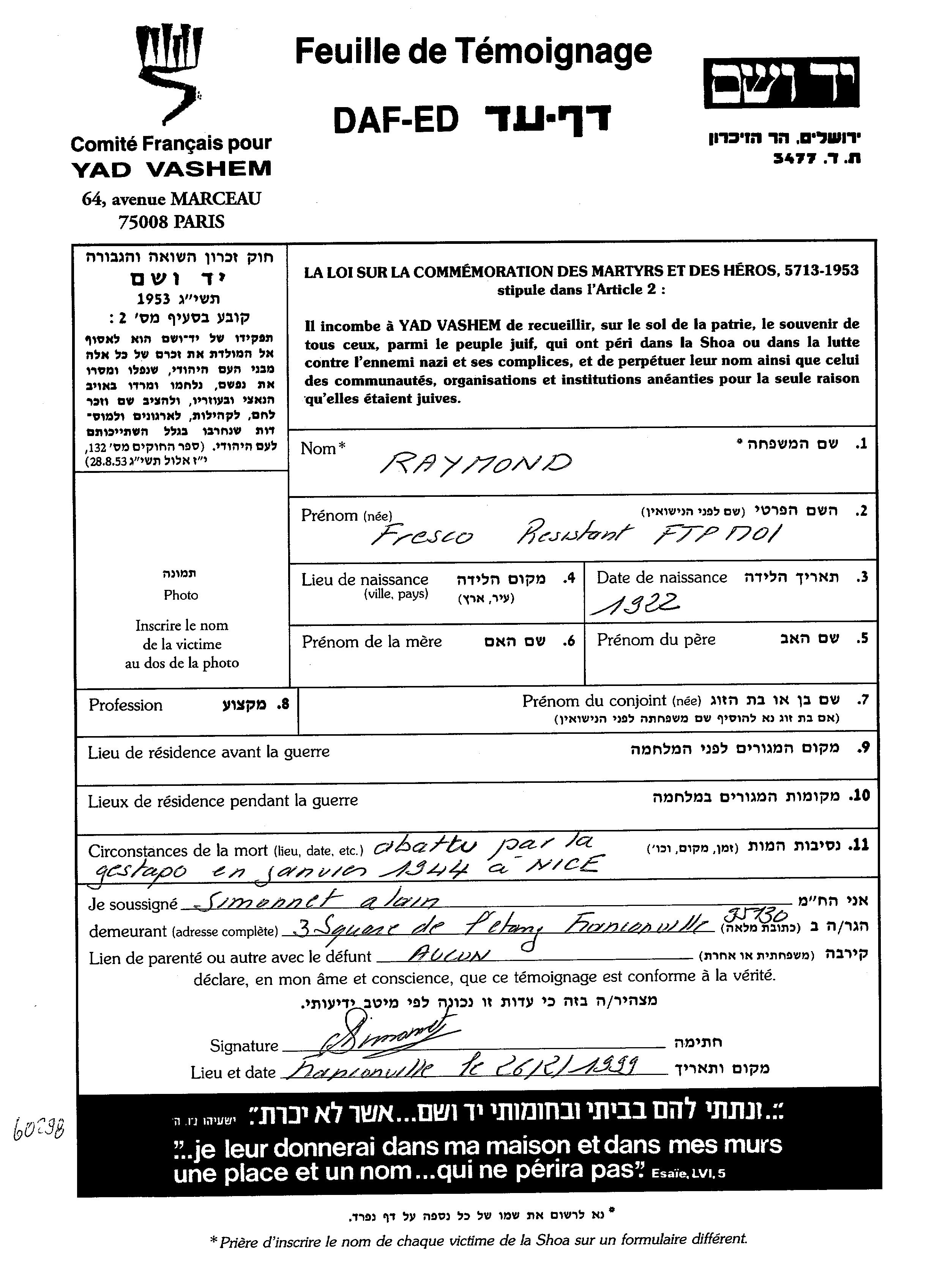 Raymond wurde in der Schoah ermordet. Todesort: Nice, Frankreich im Jahr 01/1944.