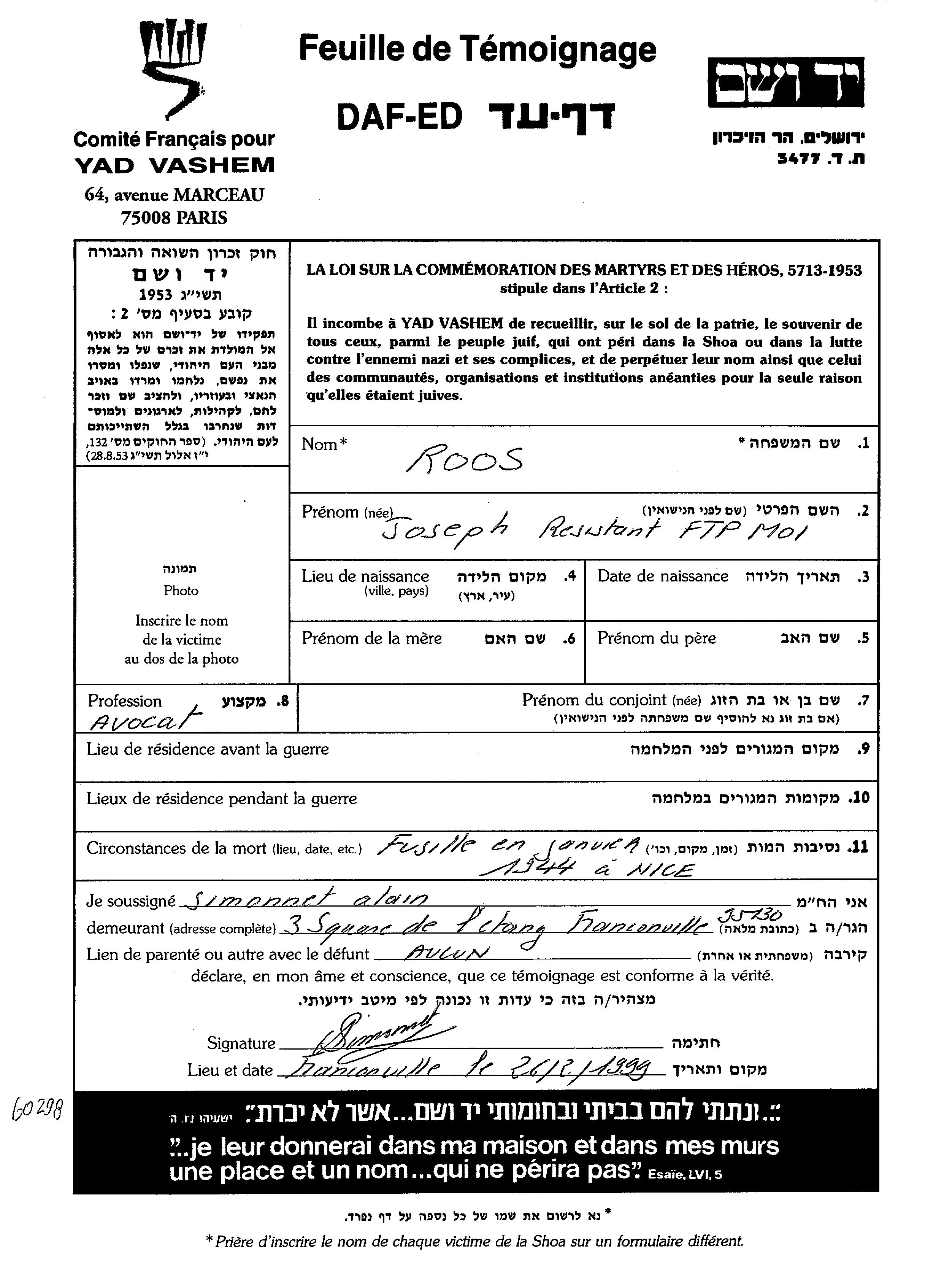 Joseph wurde in der Schoah ermordet. Todesort: Nice, Frankreich im Jahr 01/1944.