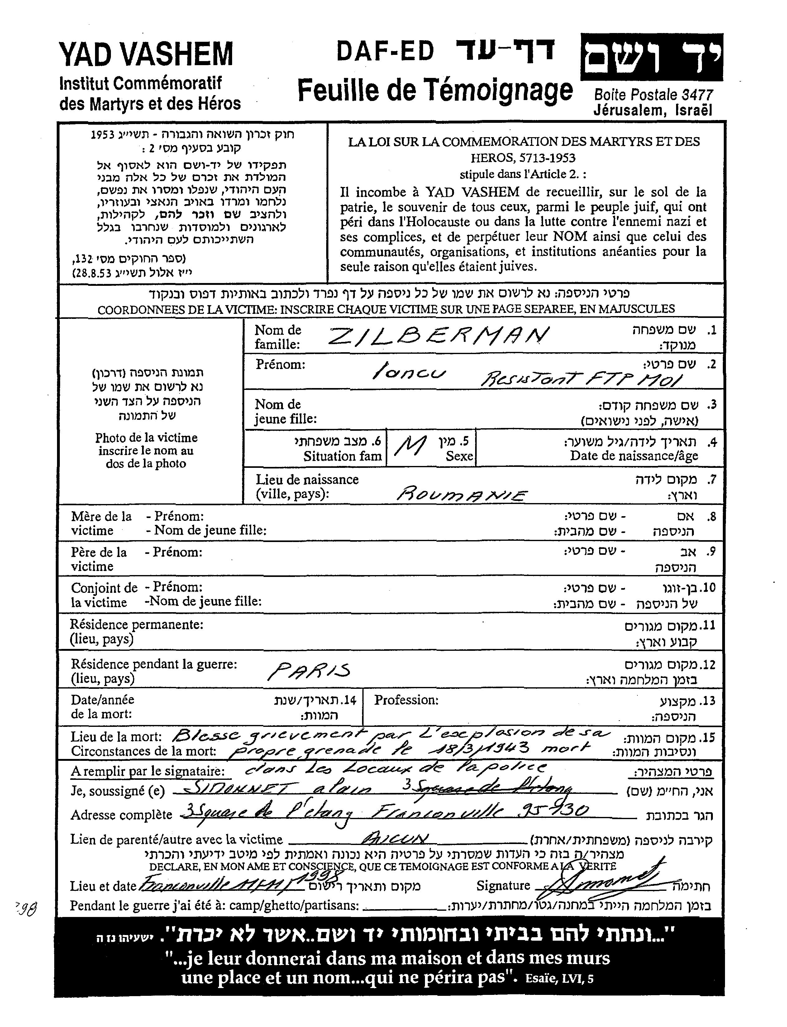 Iancu Zilberman wurde in Rumänien geboren. Während des Krieges war er in Paris, Frankreich.