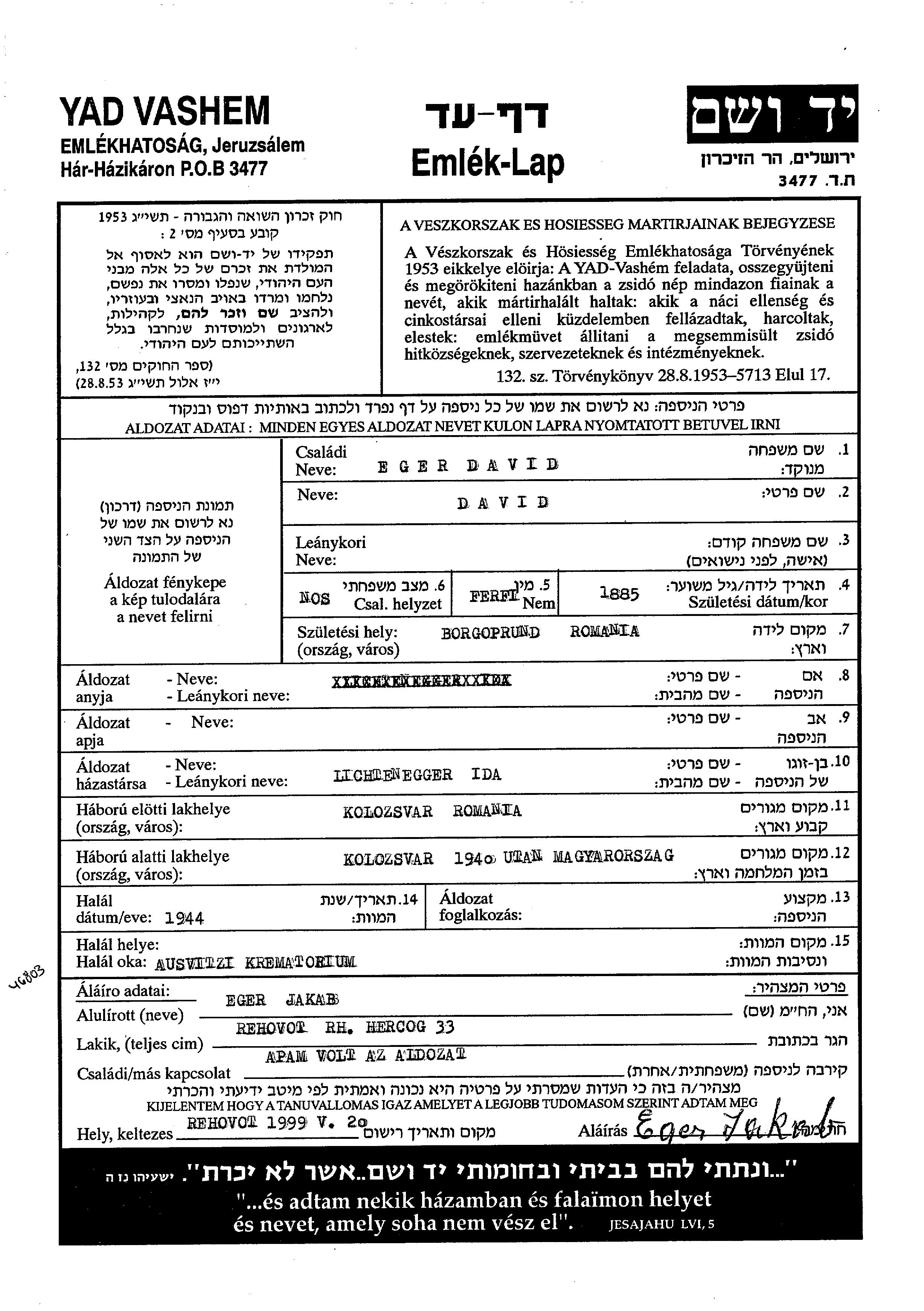 David Eger wurde im Jahr 1885 in Borgoprund, Rumänien geboren. Er war mit Ida, geb. Lichten Verheiratet. Vor dem Zweiten Weltkrieg lebte er in Koloszvar, Rumänien. Während des Krieges war er in Koloszvar, Rumänien.