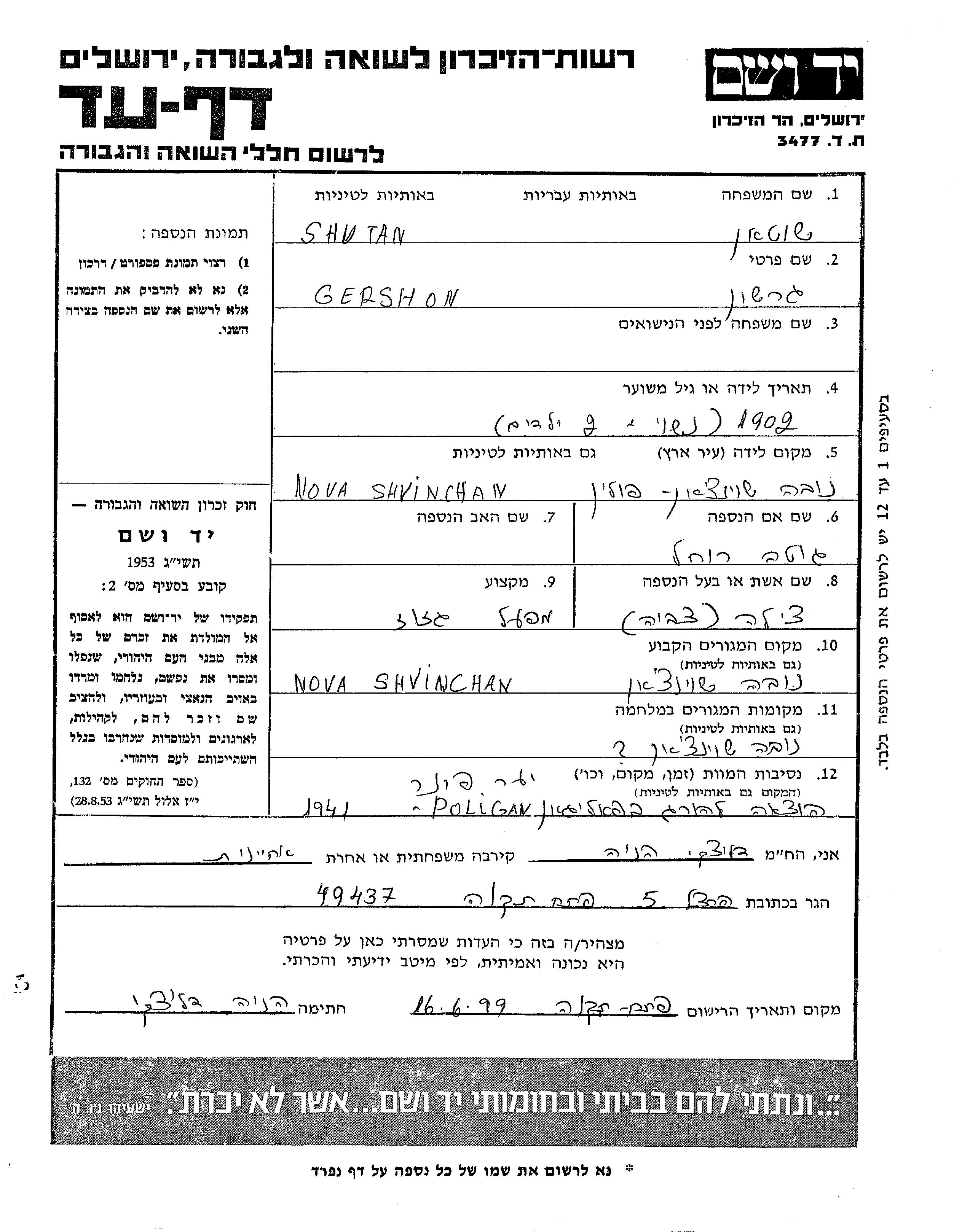 Gershon Shutan Sautan wurde im Jahr 1902 in Nowy Swiecian, Polen geboren. Er war der Sohn von Guta Rakhel. Er war Soda und mit Tzvia Tzila Verheiratet. Vor dem Zweiten Weltkrieg lebte er in Nowy Swiecian, Polen. Während des Krieges war er in Nowy Swiecian, Polen.