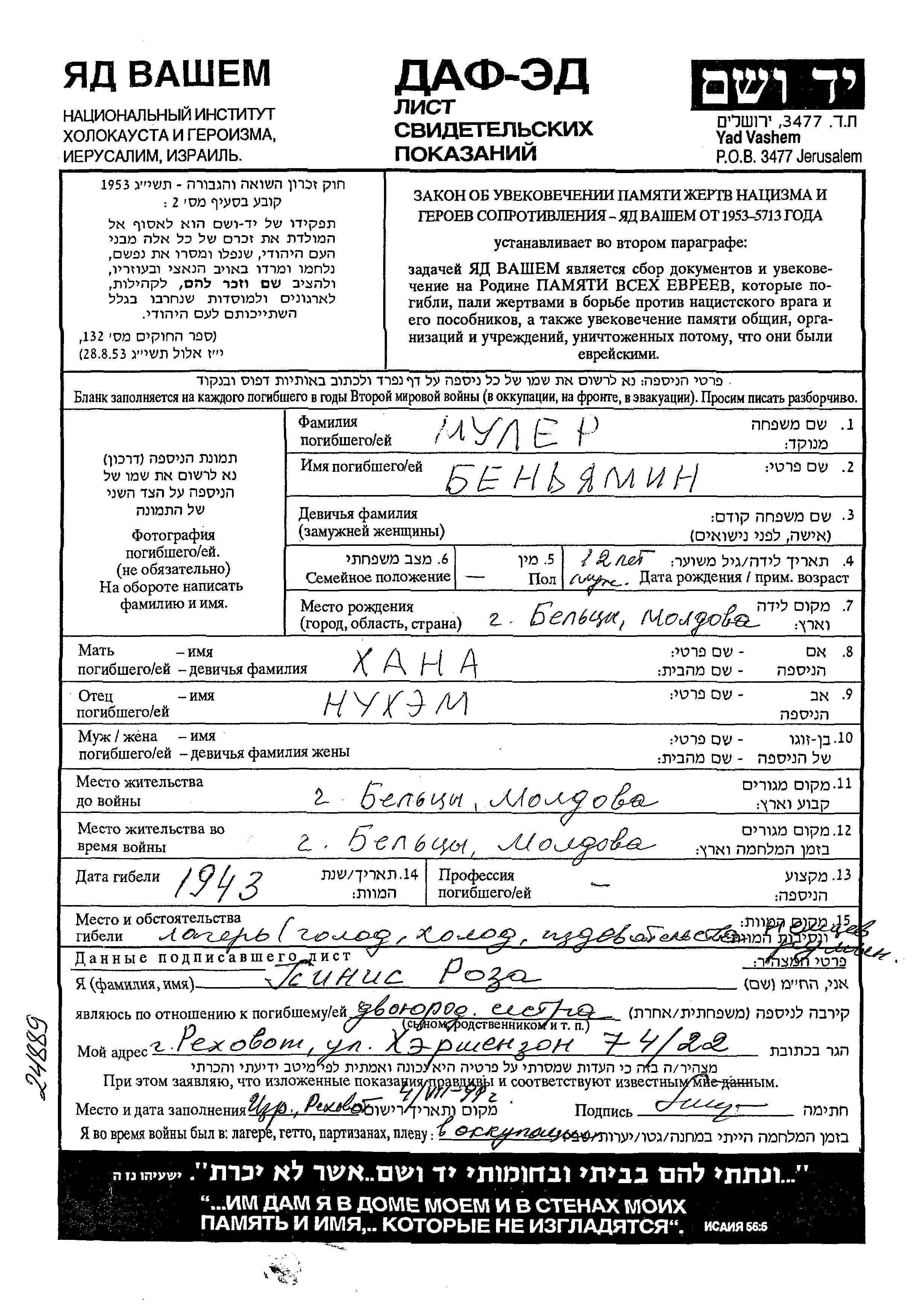 Benyamin wurde in der Schoah ermordet. Todesort: Lager im Jahr 1943.