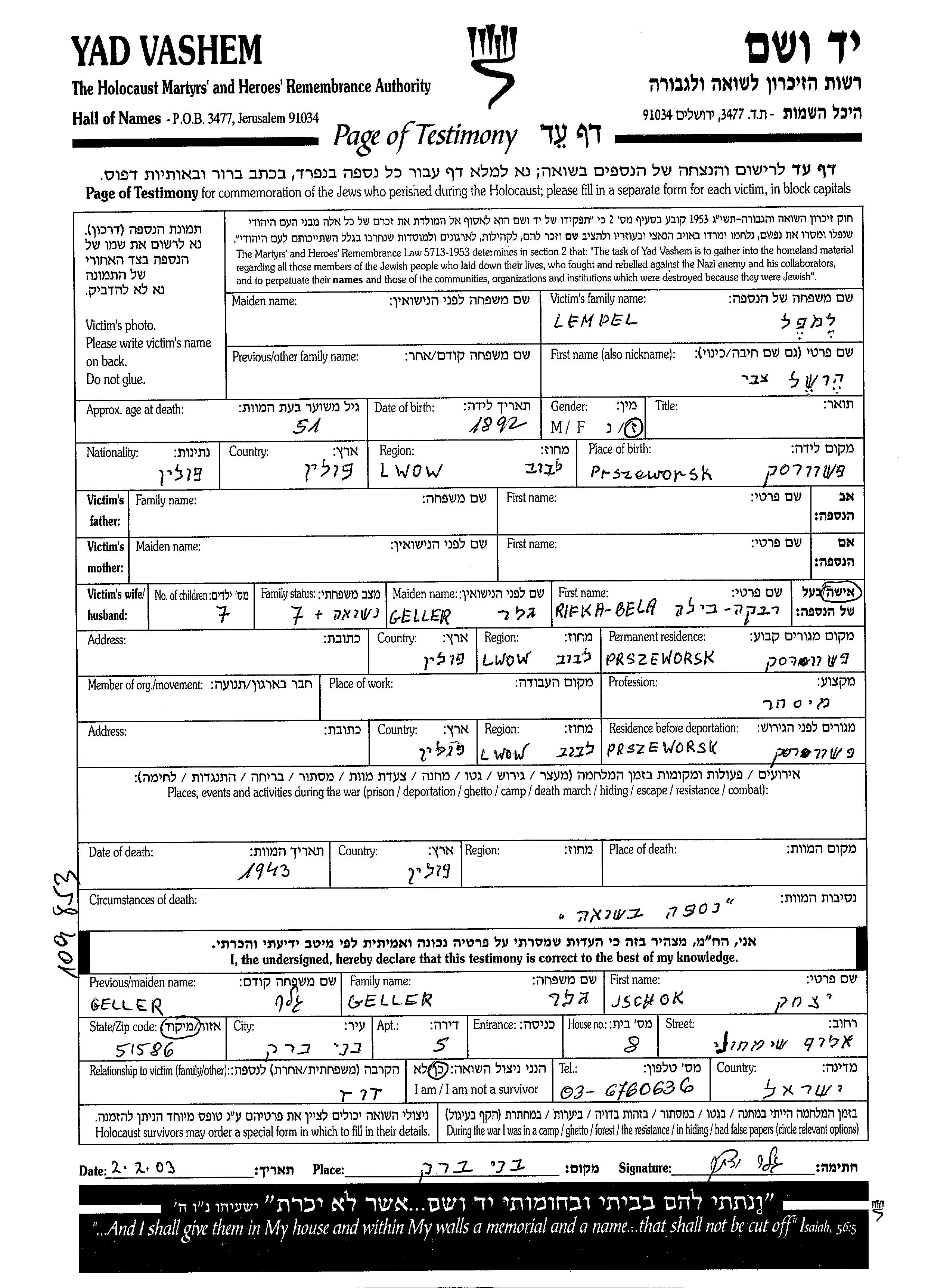 Hershel Tzvi Lampel wurde im Jahr 1892 in Przeworsk, Polen geboren. Er war Kaufmann/-frau und mit Rifka Bila, geb. Geller Verheiratet. Vor dem Zweiten Weltkrieg lebte er in Przeworsk, Polen. Während des Krieges war er in Przeworsk, Polen.