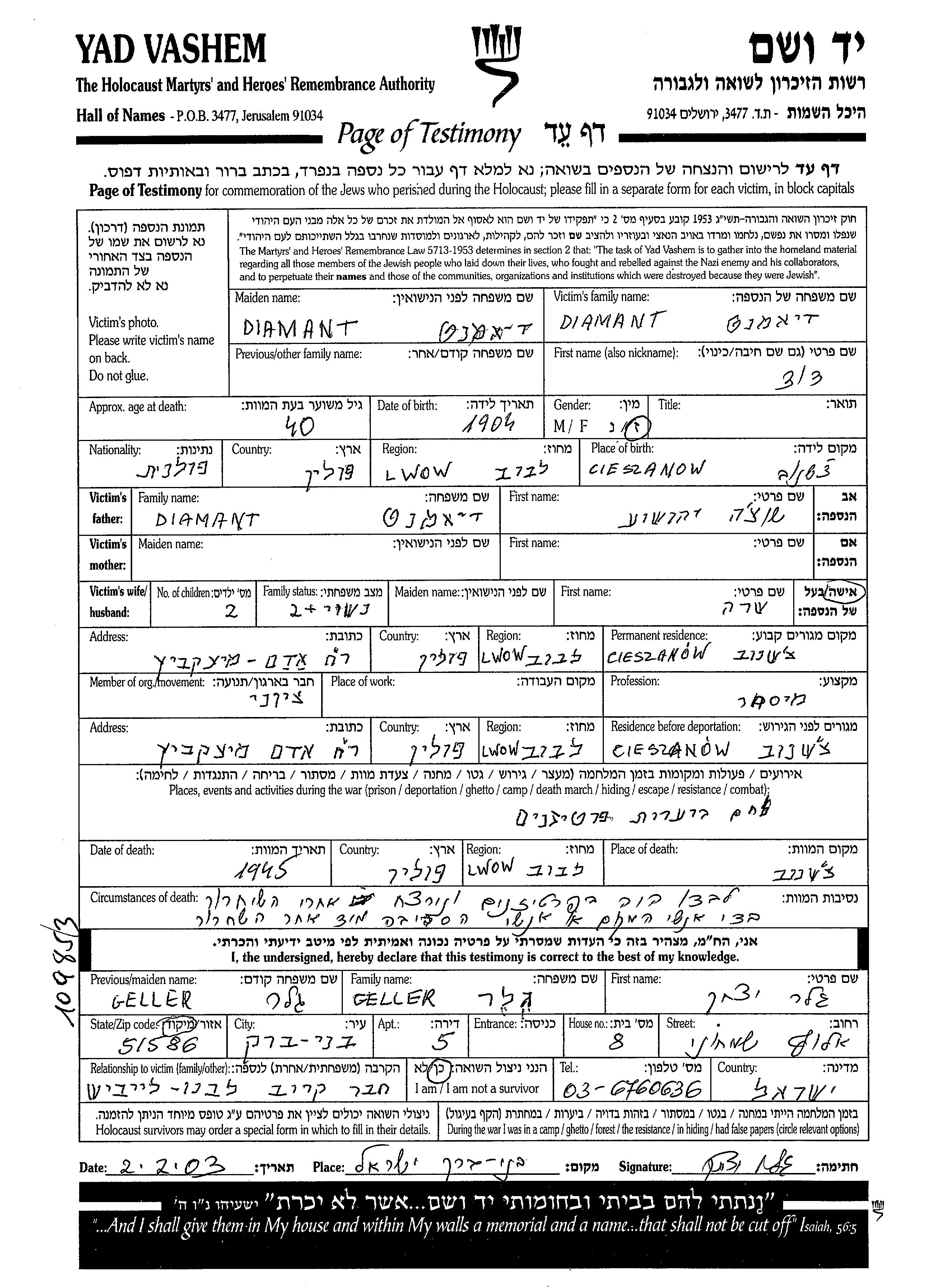 David Diamant wurde im Jahr 1904 in Cieszanow, Polen geboren. Er war der Sohn von Shotze Yehoshua. Er war Kaufmann/-frau und mit Sara Verheiratet. Vor dem Zweiten Weltkrieg lebte er in Cieszanow, Polen. Während des Krieges war er in Cieszanow, Polen.