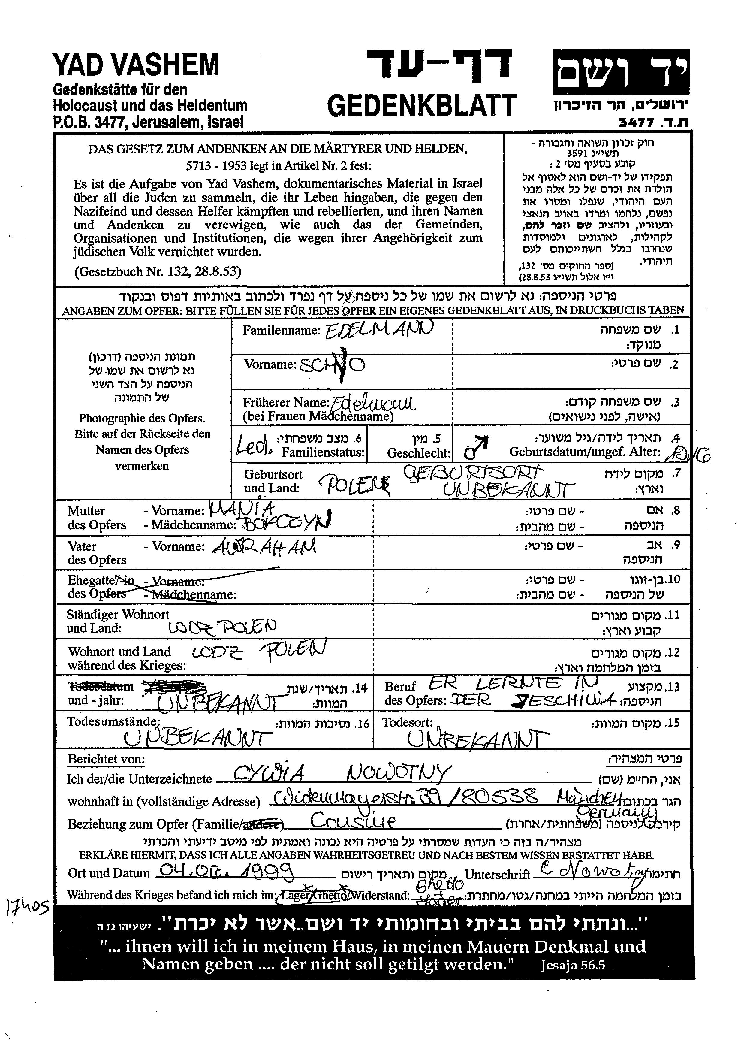 Schilo Edelmann wurde im Jahr 1916 in Polen geboren. Er war der Sohn von Awraham und Mania, geb. Bokczyn. Er war Ledig. Vor dem Zweiten Weltkrieg lebte er in Lodz, Polen. Während des Krieges war er in Lodz, Polen.
