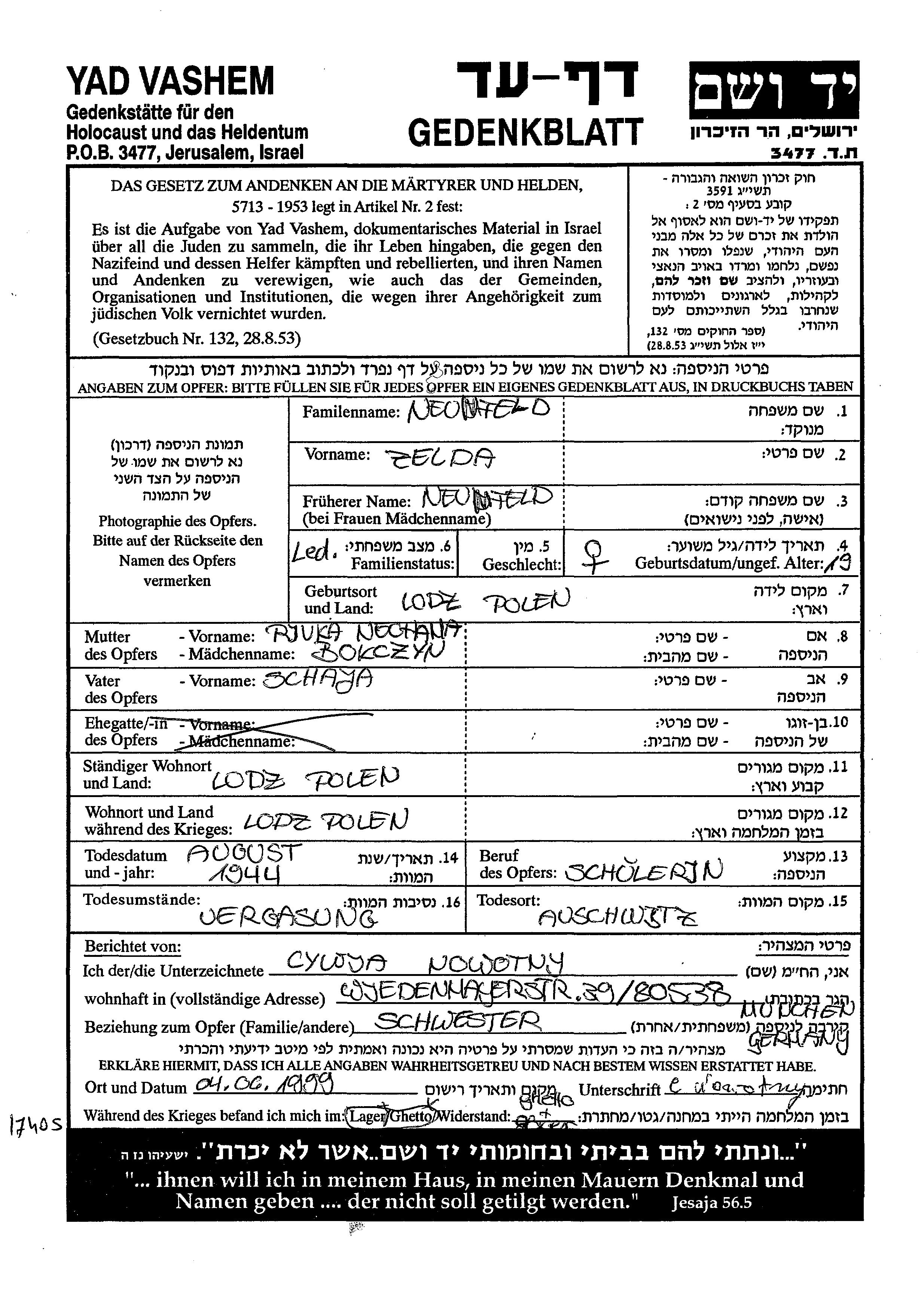 Neufeld Zelda Lodz, Polen Gedenkblatt