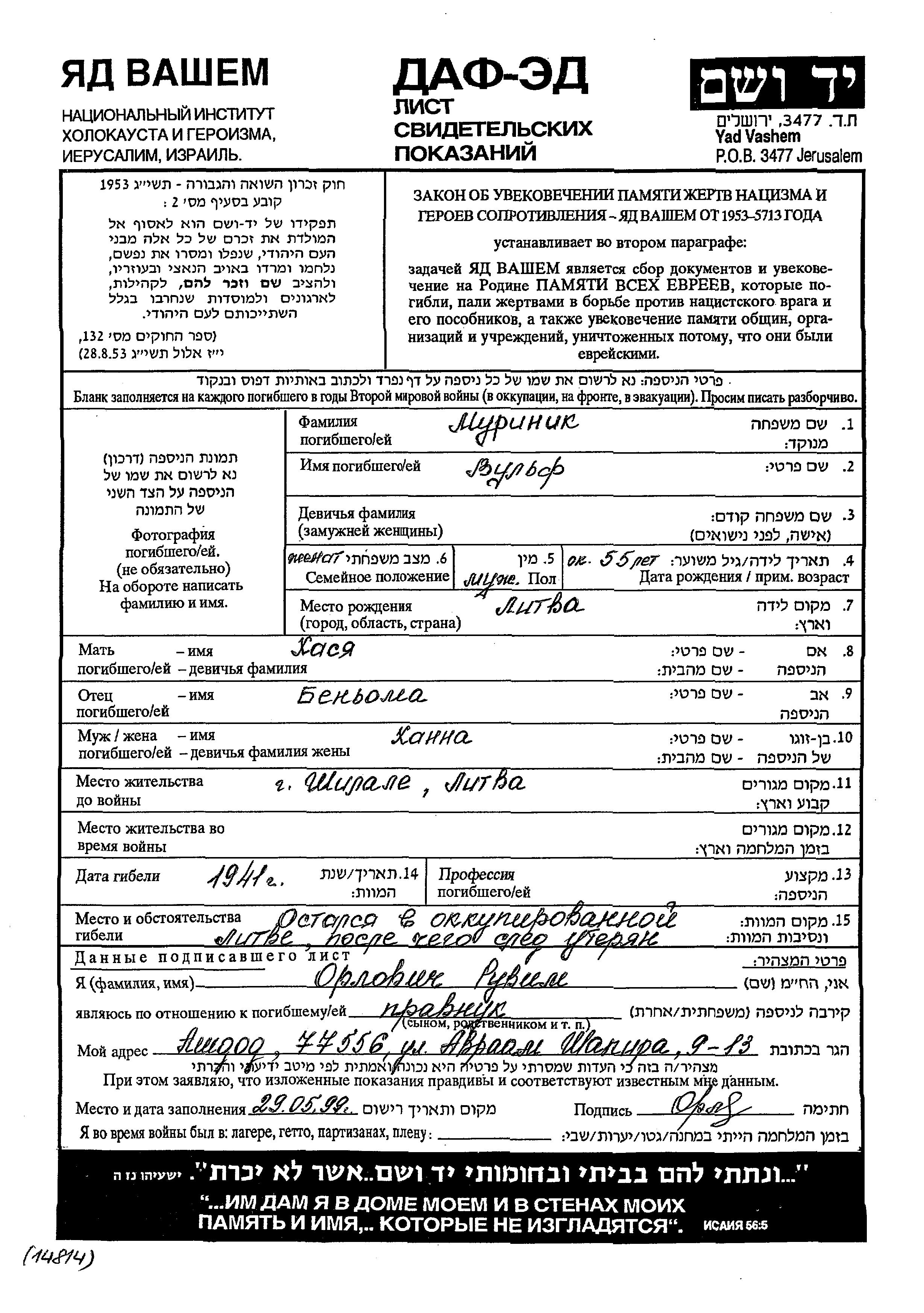 Vulf Murinik wurde im Jahr 1886 in Litauen geboren. Er war der Sohn von Benyoma und Khasya. Er war mit Khanna Verheiratet. Vor dem Zweiten Weltkrieg lebte er in Shilale, Litauen. Während des Krieges war er in Litauen.