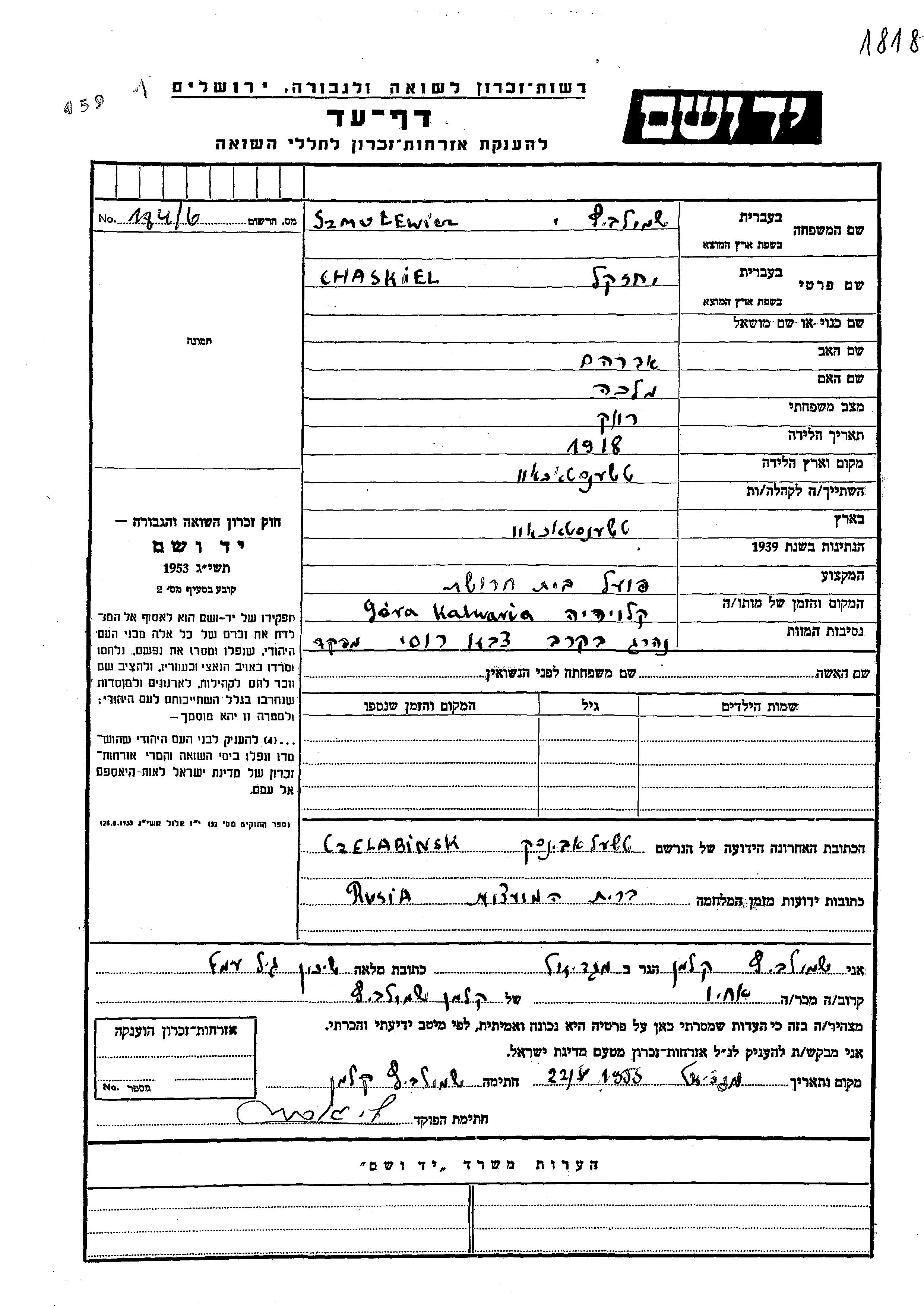 Chaskiel wurde in der Schoah ermordet. Todesort: Gora Kalwaria, Polen.