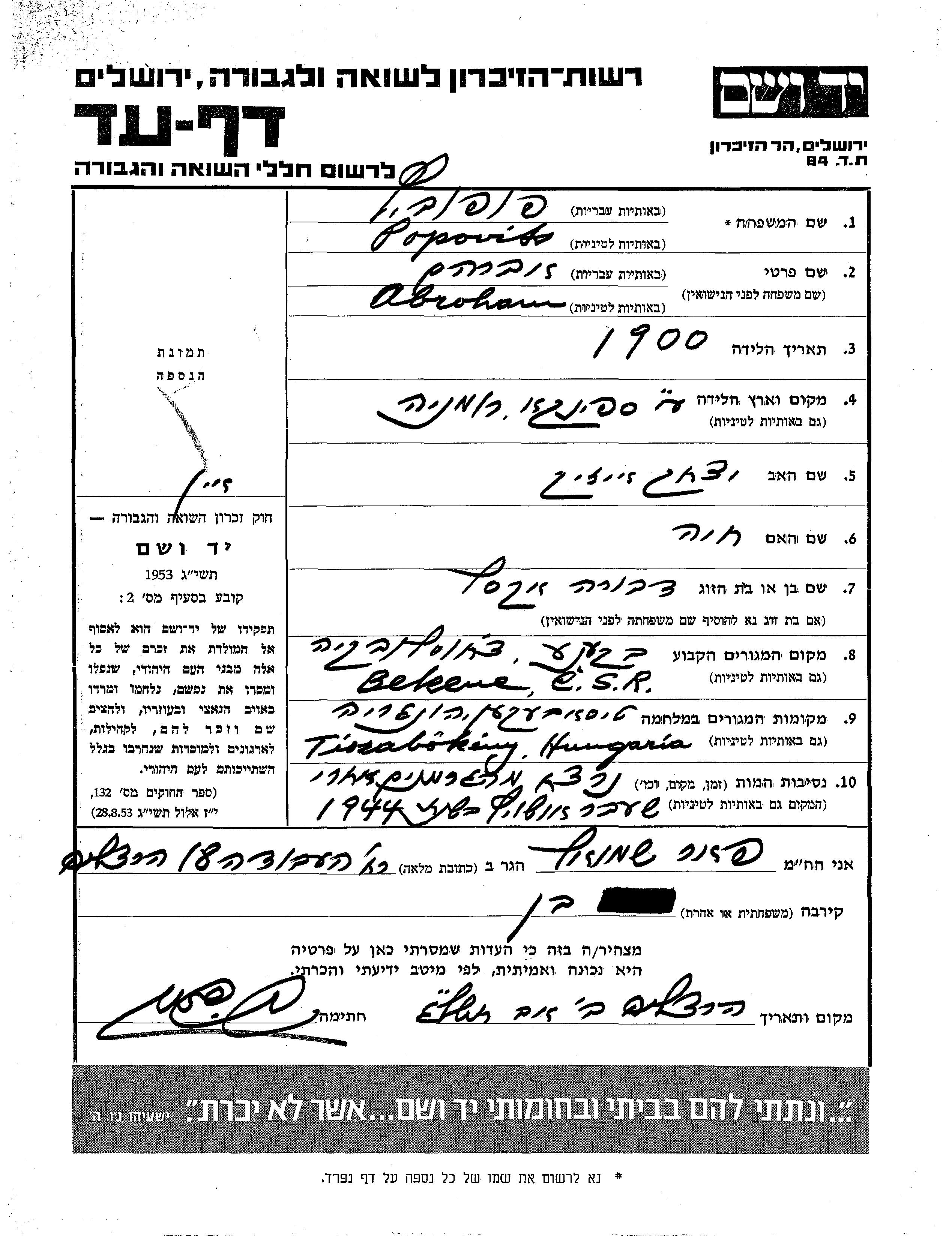 Abraham Popovits wurde im Jahr 1900 in Sapanta, Rumänien geboren. Er war der Sohn von Yitzkhak und Khaia. Vor dem Zweiten Weltkrieg lebte er in Beken, Tschechoslowakei. Während des Krieges war er in Tiszabokeny, Tschechoslowakei.