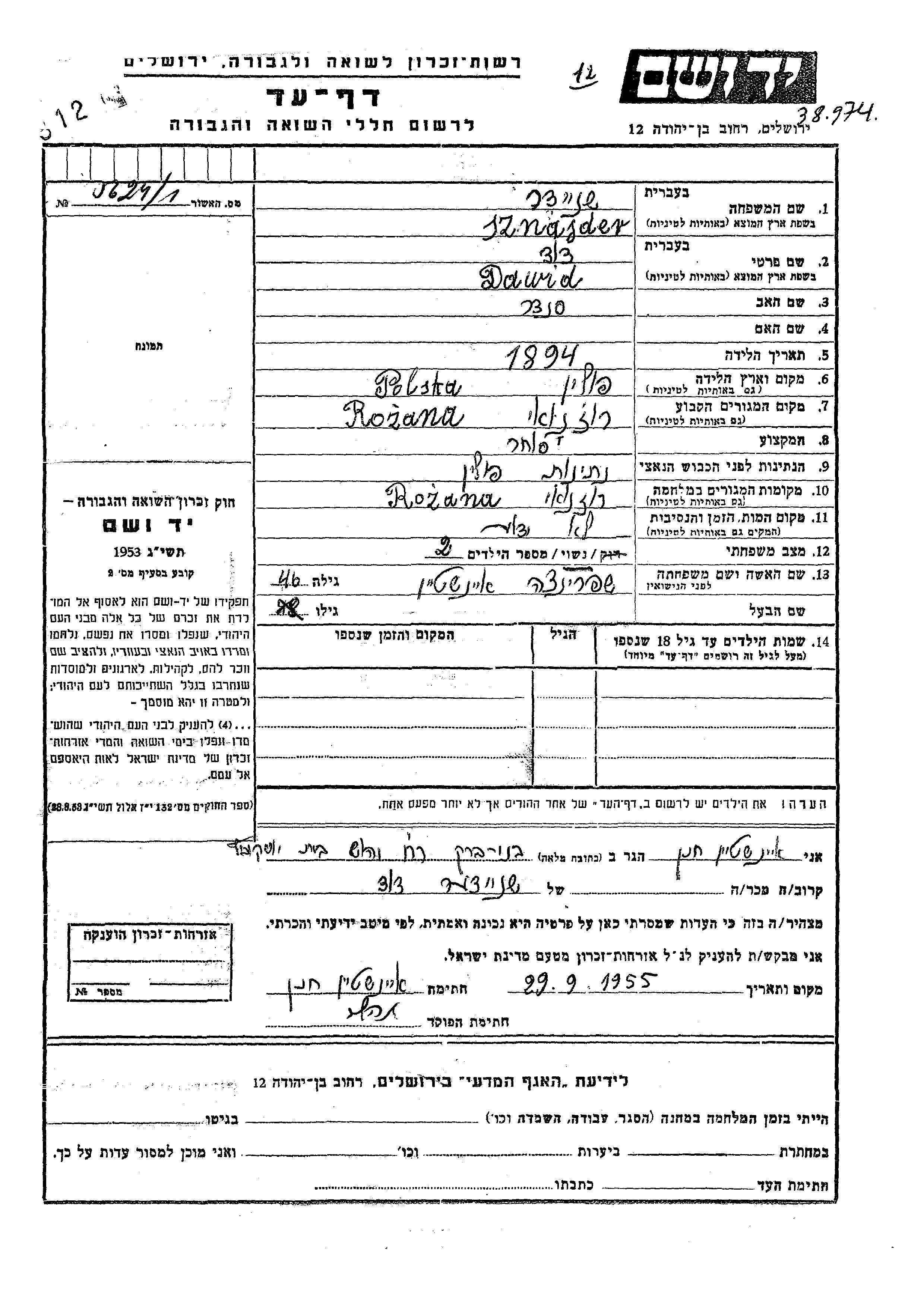 Dawid Sznajder wurde im Jahr 1894 in Polen geboren. Er war der Sohn von Sender. Er war Kaufmann/-frau und mit Shprintza, geb. Einshtein Verheiratet. Vor dem Zweiten Weltkrieg lebte er in Rozana, Polen. Während des Krieges war er in Rozana, Polen.