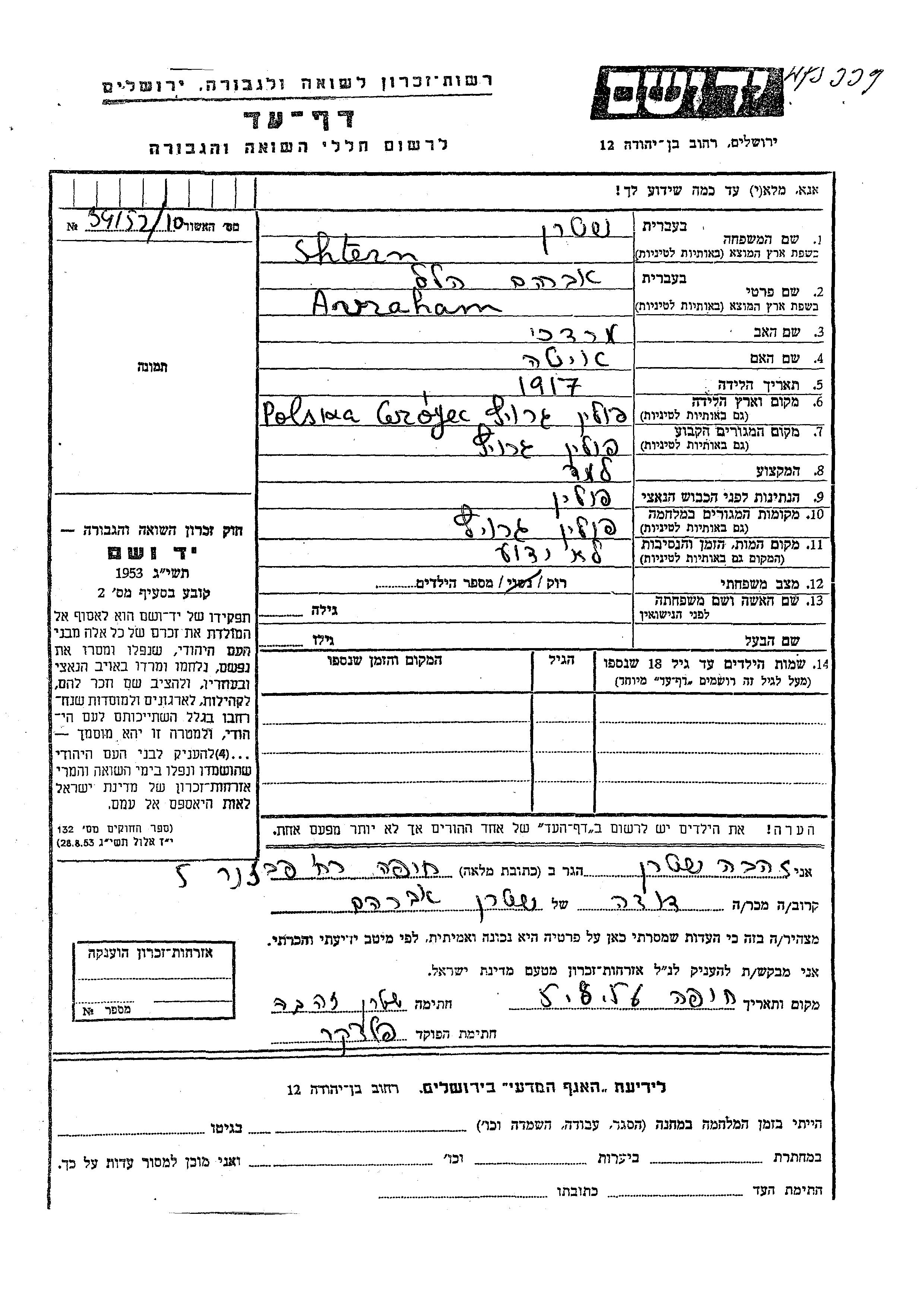 Avraham Hilel Shtern wurde im Jahr 1917 in Grojec, Polen geboren. Er war der Sohn von Mordekhai und Ita. Er war Schüler/-in und Ledig. Vor dem Zweiten Weltkrieg lebte er in Grojec, Polen. Während des Krieges war er in Grojec, Polen.