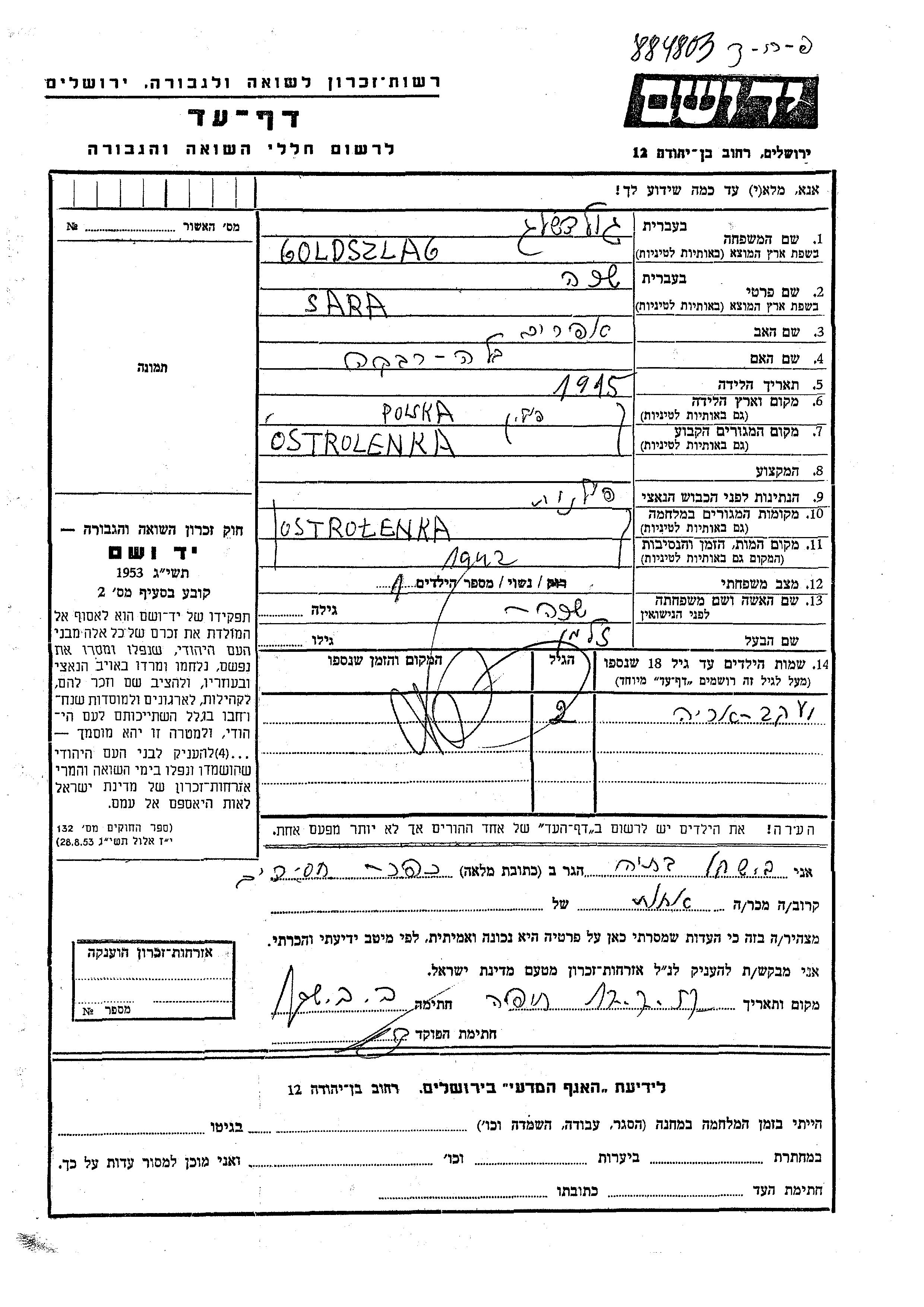 Goldszlag Sara 1915 Ostrolenka, Polen Gedenkblatt
