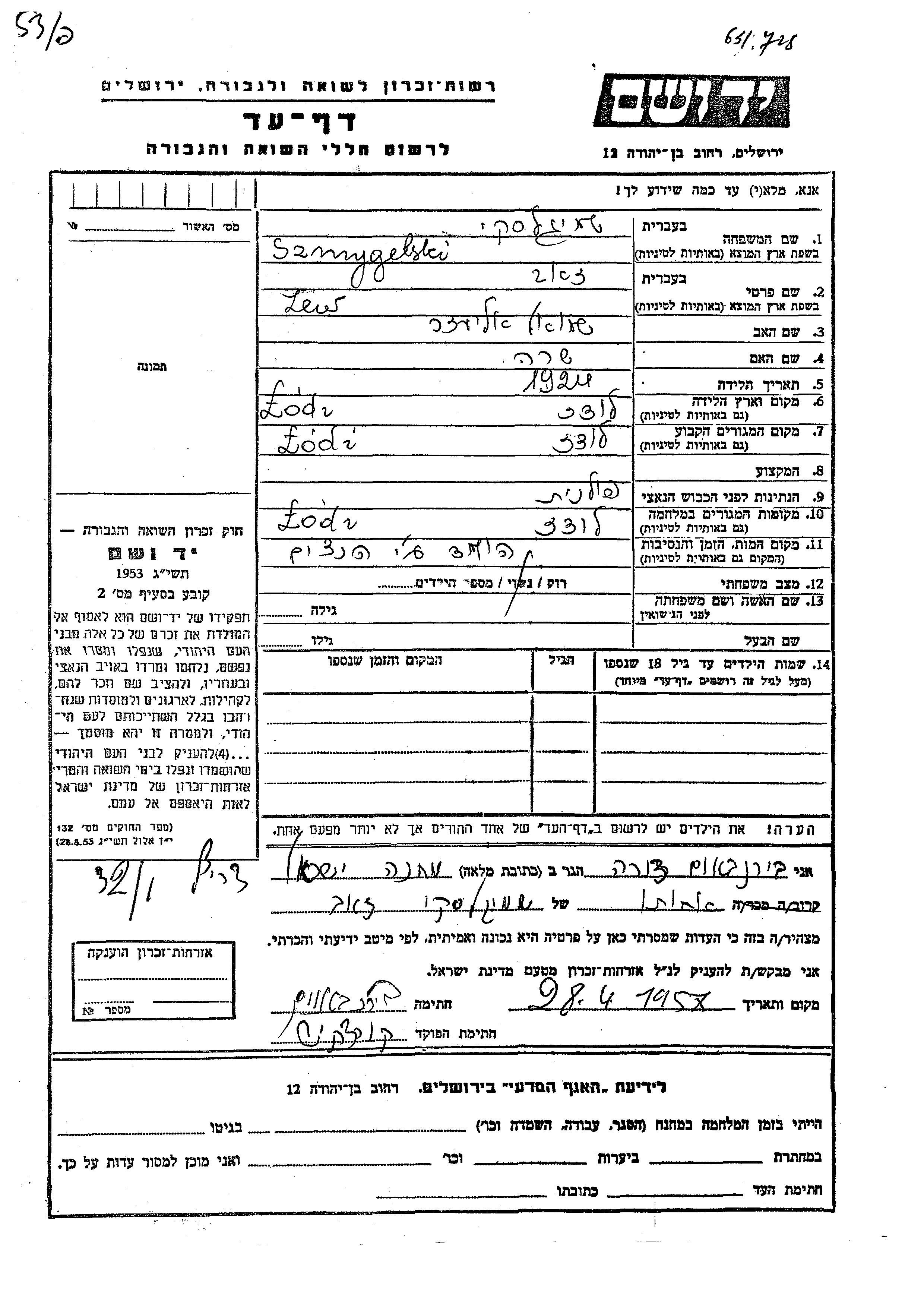 Zew Szmygelski wurde im Jahr 1924 in Lodz, Polen geboren. Er war der Sohn von Shmuel Eliezer und Sara. Er war Ledig. Vor dem Zweiten Weltkrieg lebte er in Lodz, Polen. Während des Krieges war er in Lodz, Polen.