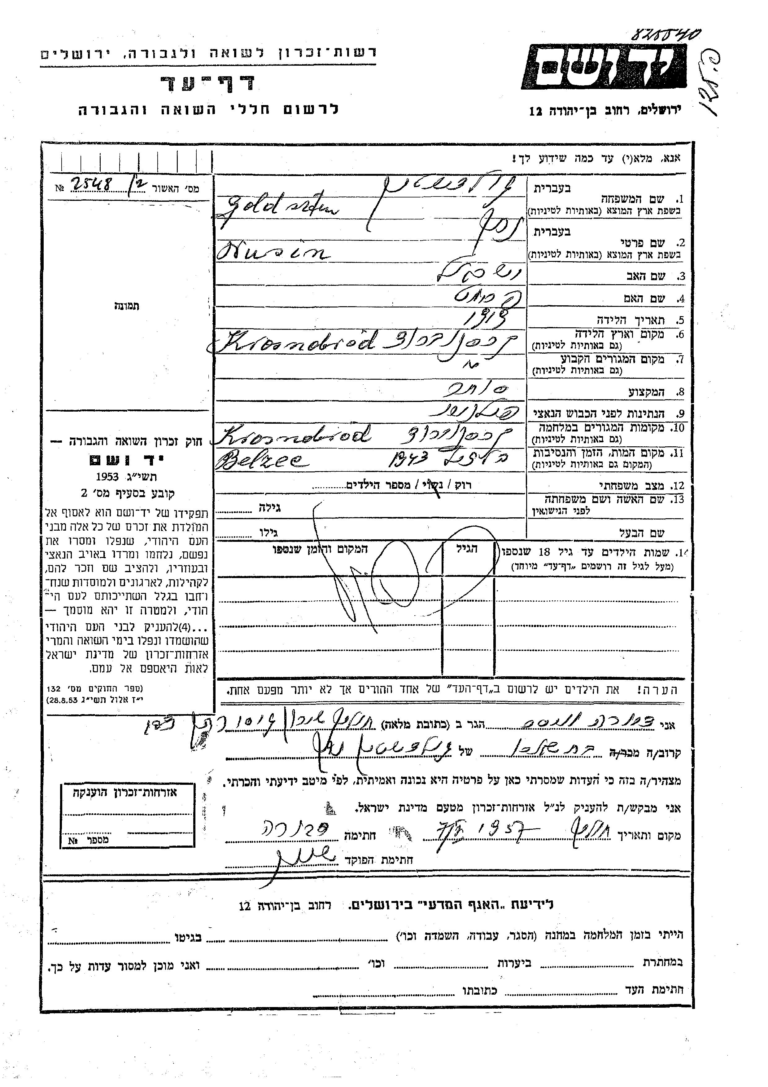 Goldsztin Nusin 1919 Krosnobrod, Polen Gedenkblatt