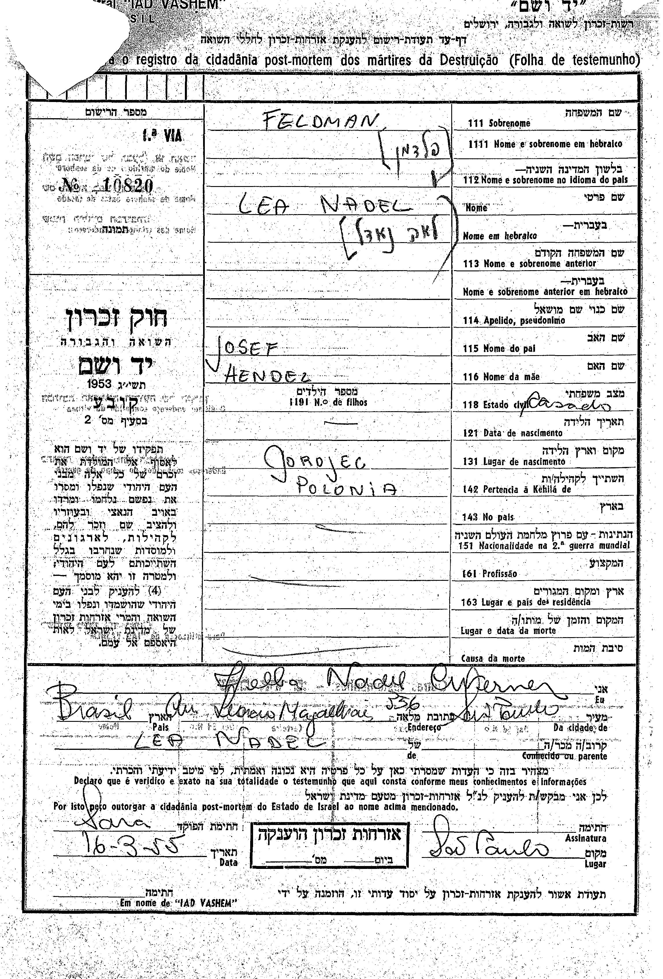Lea Feldman, geb. Nadel wurde in Gorojec, Polen geboren. Sie war die Tochter von Josef und Hendel. Sie war Verheiratet. Vor dem Zweiten Weltkrieg lebte sie in Polen.