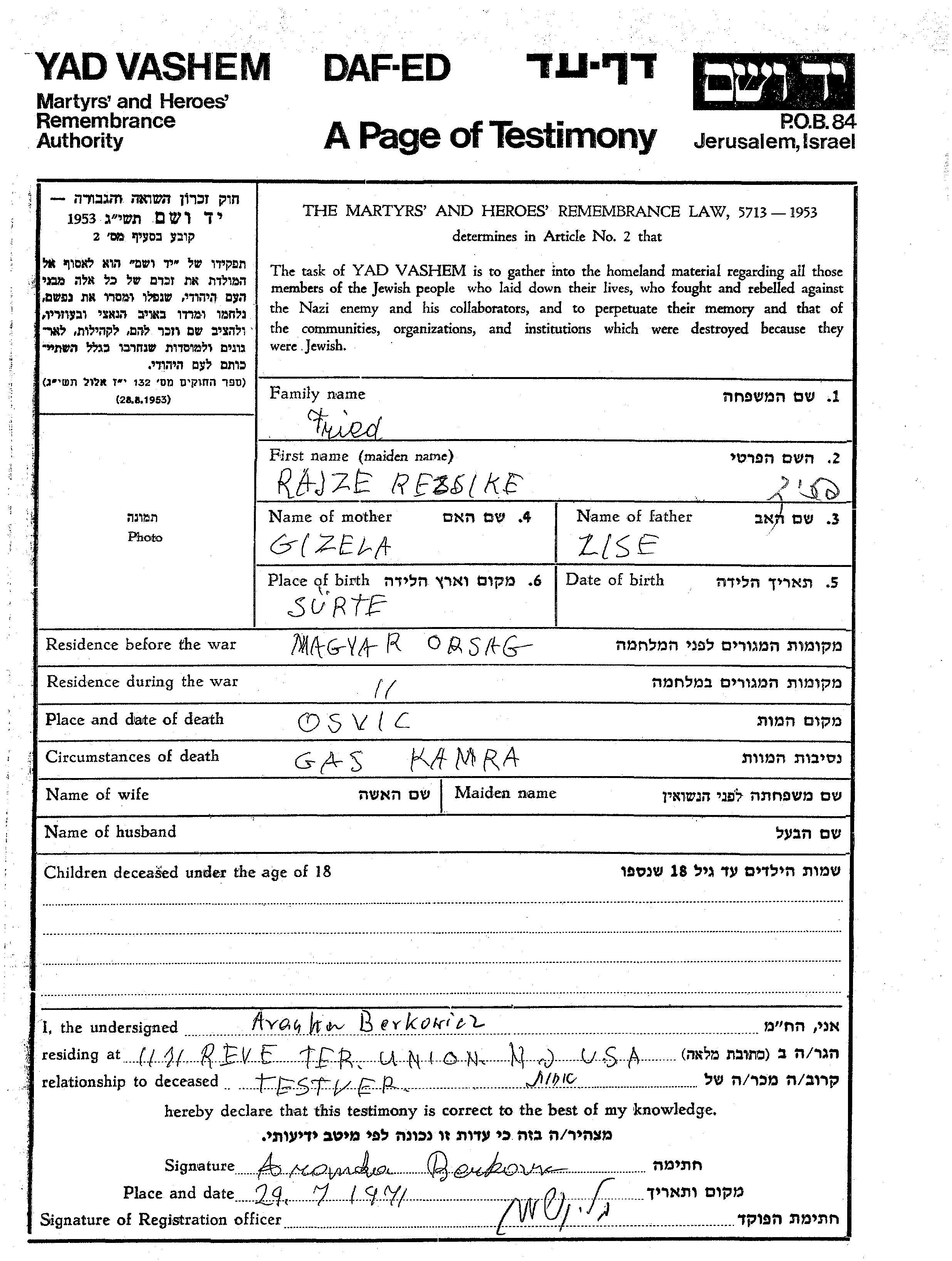 Rajze Rezsike wurde in der Schoah ermordet. Todesort: Auschwitz, Polen.