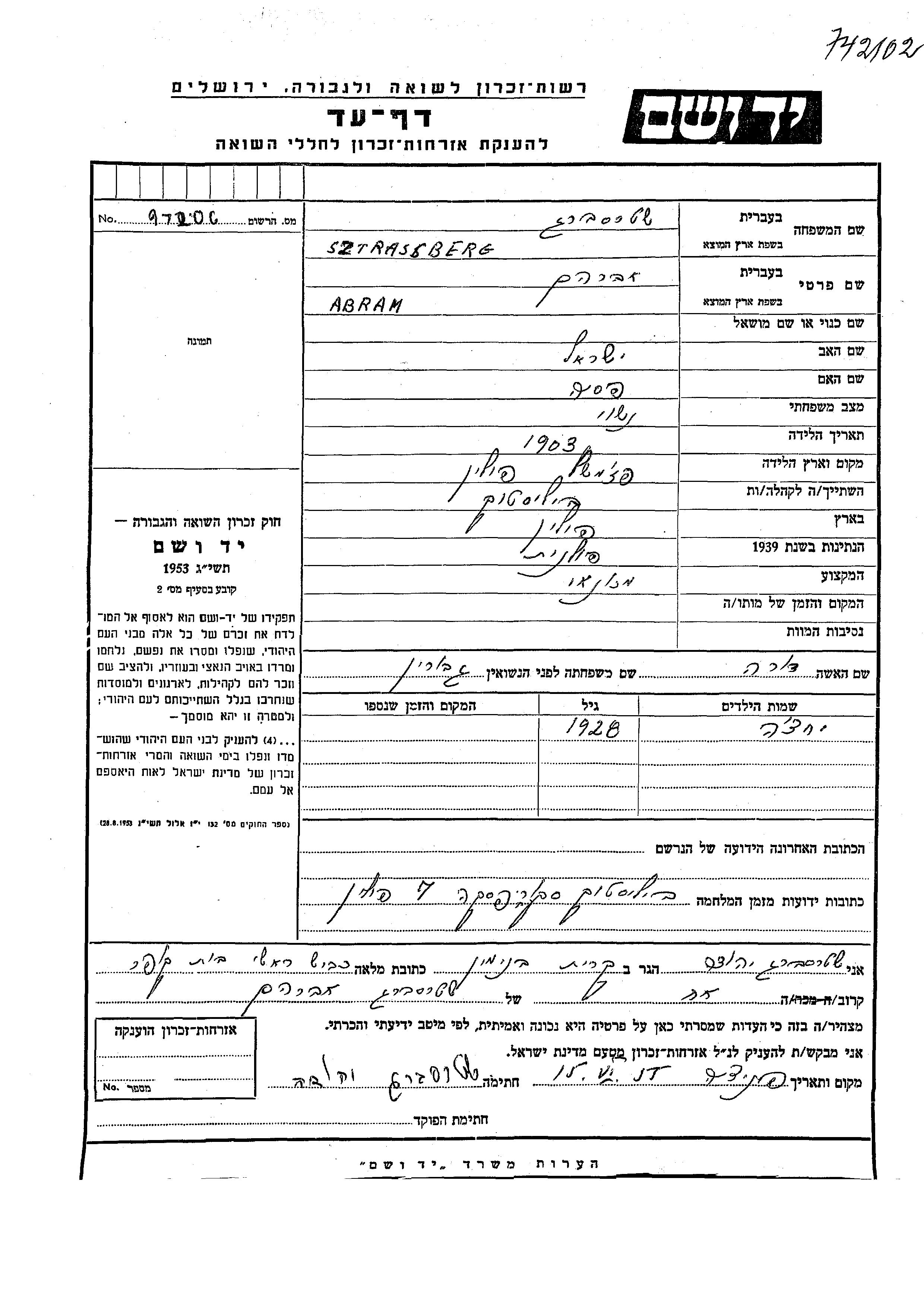 Abram Sztrassberg wurde im Jahr 1903 in Przemysl, Polen geboren. Er war der Sohn von Srael und Pesia. Er war Mechaniker/-in und mit Dora, geb. Gavurin Verheiratet. Vor dem Zweiten Weltkrieg lebte er in Bialystok, Polen. Während des Krieges war er in Bialystok, Polen.
