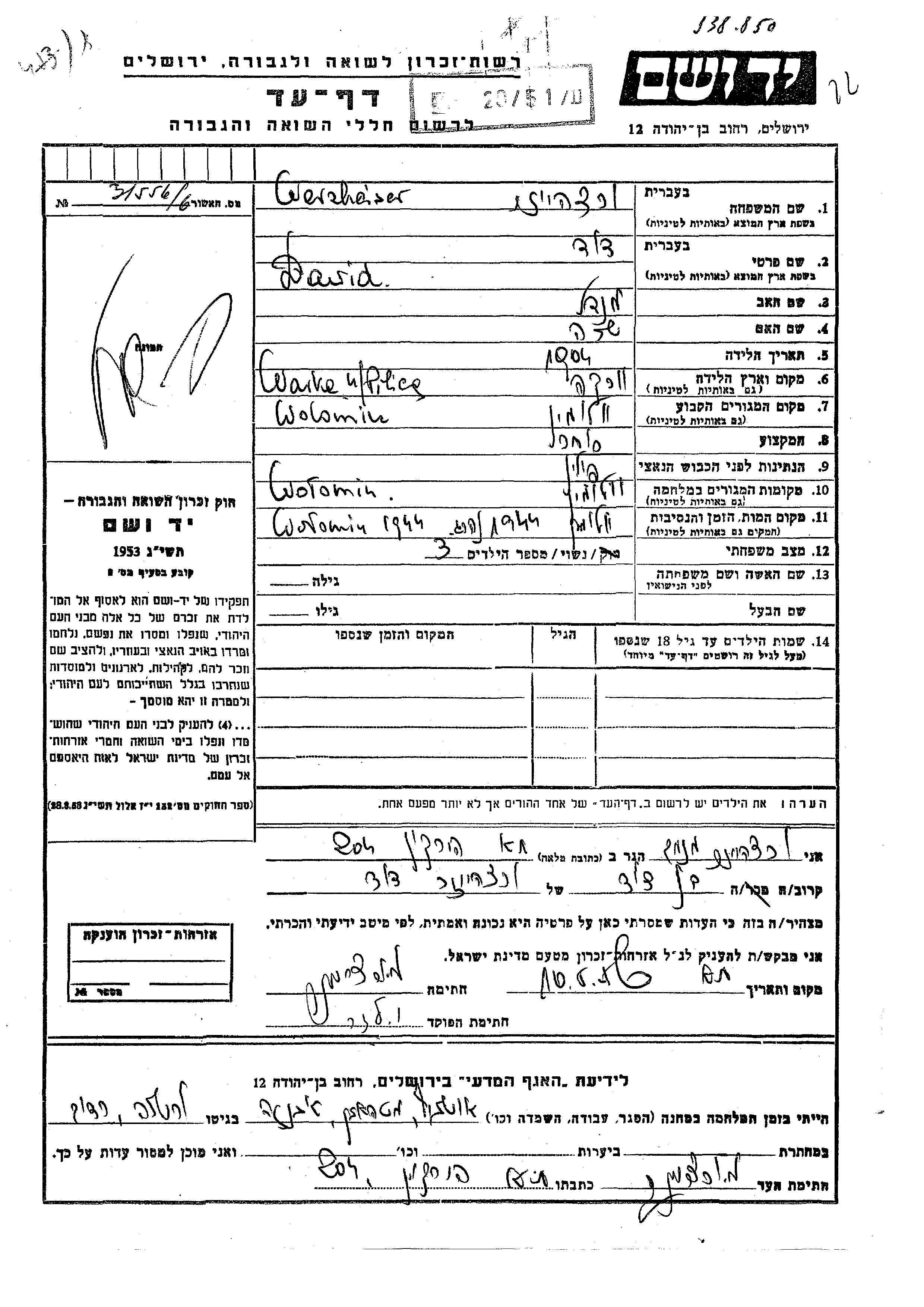 Dawid wurde in der Schoah ermordet. Todesort: Wolomin, Polen im Jahr 1944.
