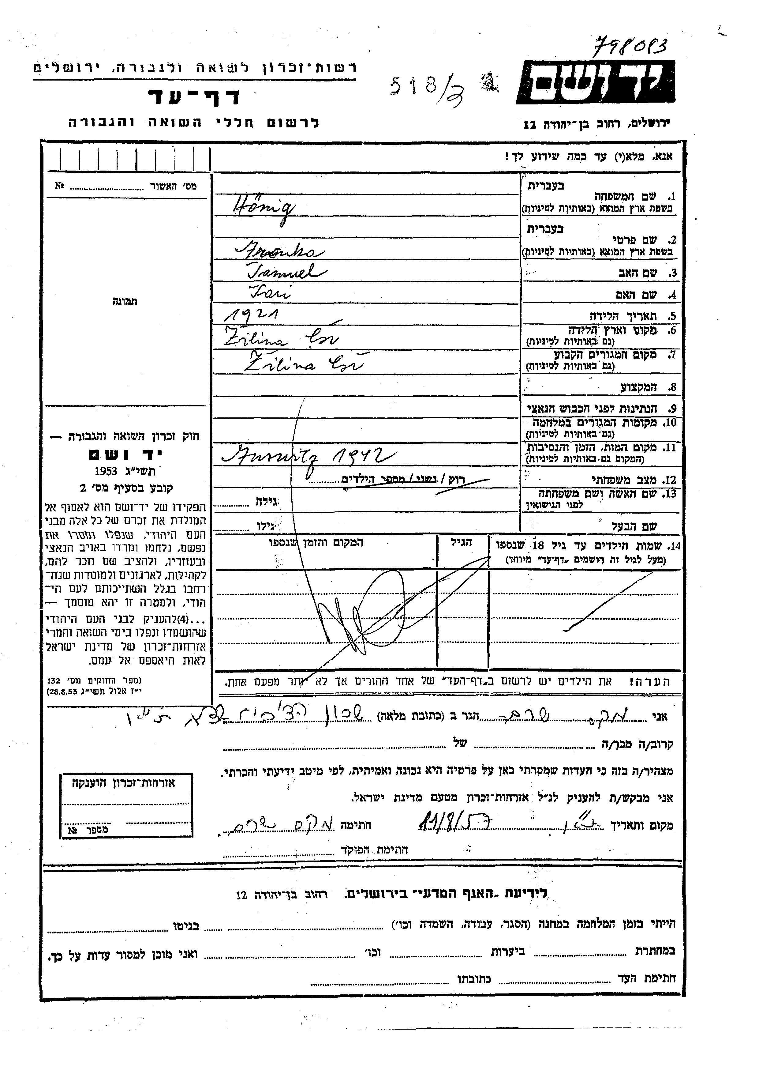 Aranka Honig wurde im Jahr 1921 in Zilina, Tschechoslowakei geboren. Sie war die Tochter von Samuel und Fani. Sie war Ledig. Vor dem Zweiten Weltkrieg lebte sie in Zilina, Tschechoslowakei.