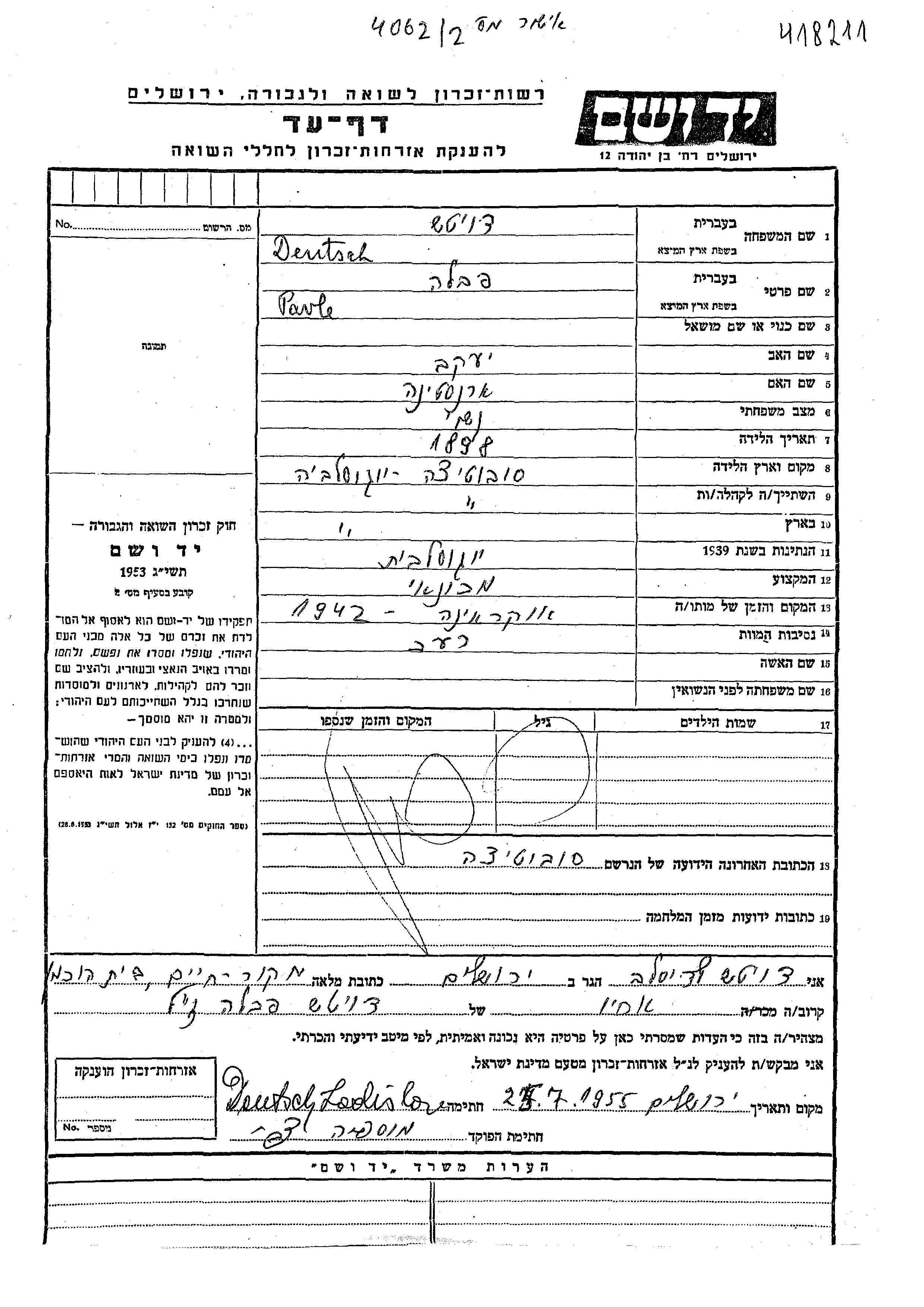 Pavle Deutsch wurde im Jahr 1898 in Subotica, Jugoslawien geboren. Er war der Sohn von Yaakov und Ernestina. Er war Mechaniker/-in und Verheiratet. Vor dem Zweiten Weltkrieg lebte er in Subotica, Jugoslawien.