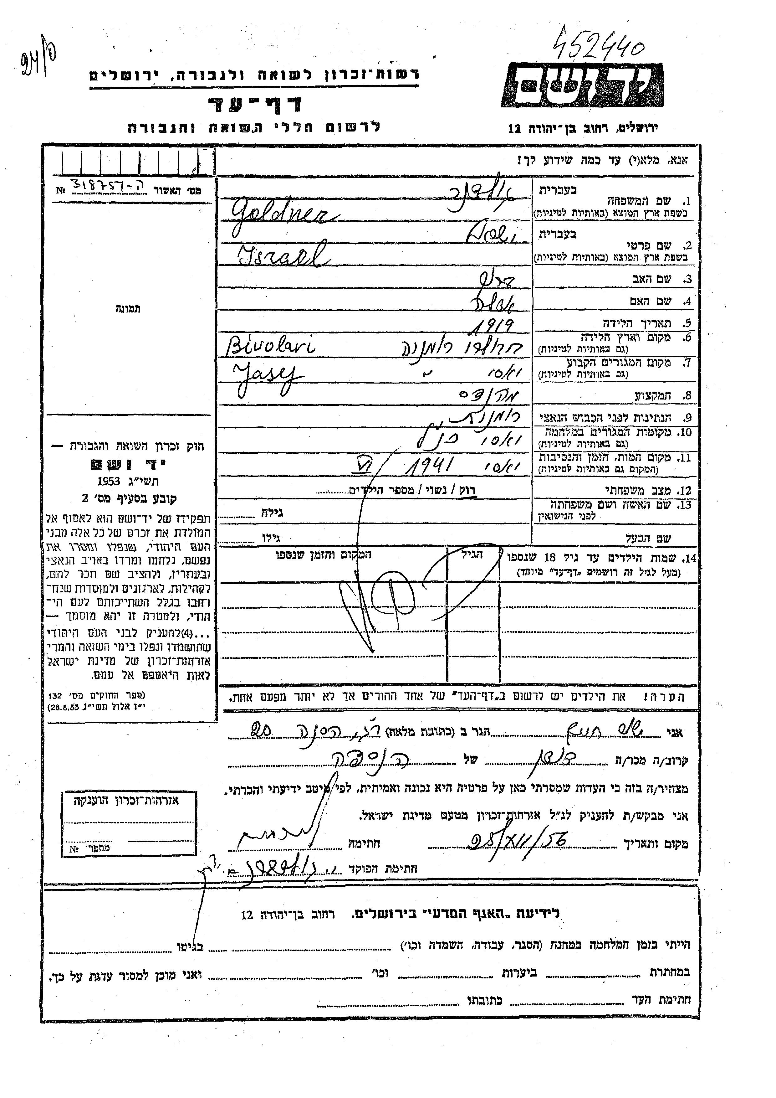 Israel Goldner wurde im Jahr 1919 in Bivolari, Rumänien geboren. Er war der Sohn von Barukh und Adela. Er war Ingenieur und Ledig. Vor dem Zweiten Weltkrieg lebte er in Jassy, Rumänien. Während des Krieges war er in Jassy, Rumänien.