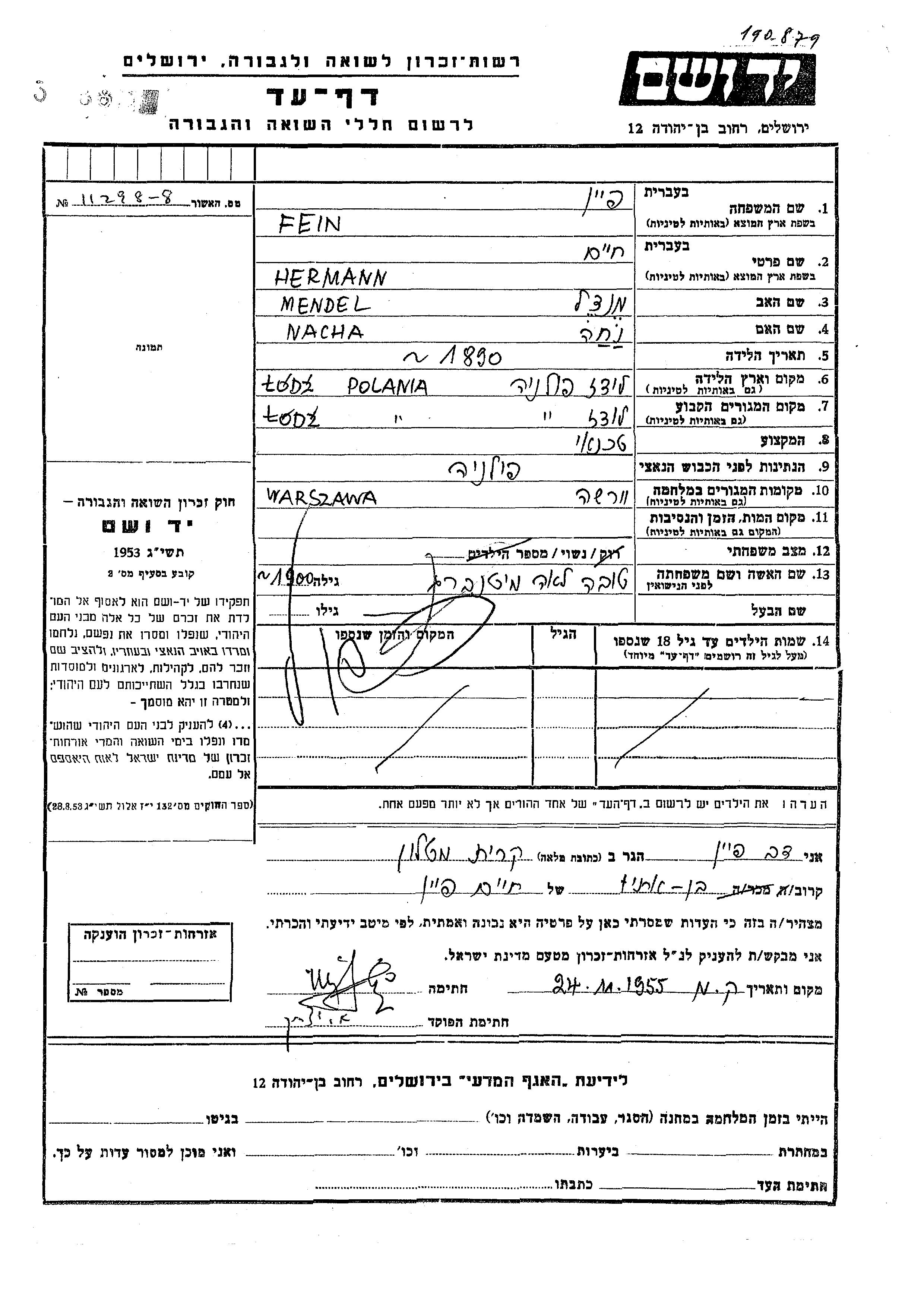 Hermann Khaim Fein wurde im Jahr 1890 in Lodz, Polen geboren. Er war der Sohn von Mendel und Nacha. Er war Techniker/-in und mit Tova Lea, geb. Mitenberg Verheiratet. Vor dem Zweiten Weltkrieg lebte er in Lodz, Polen. Während des Krieges war er in Warszawa, Polen.