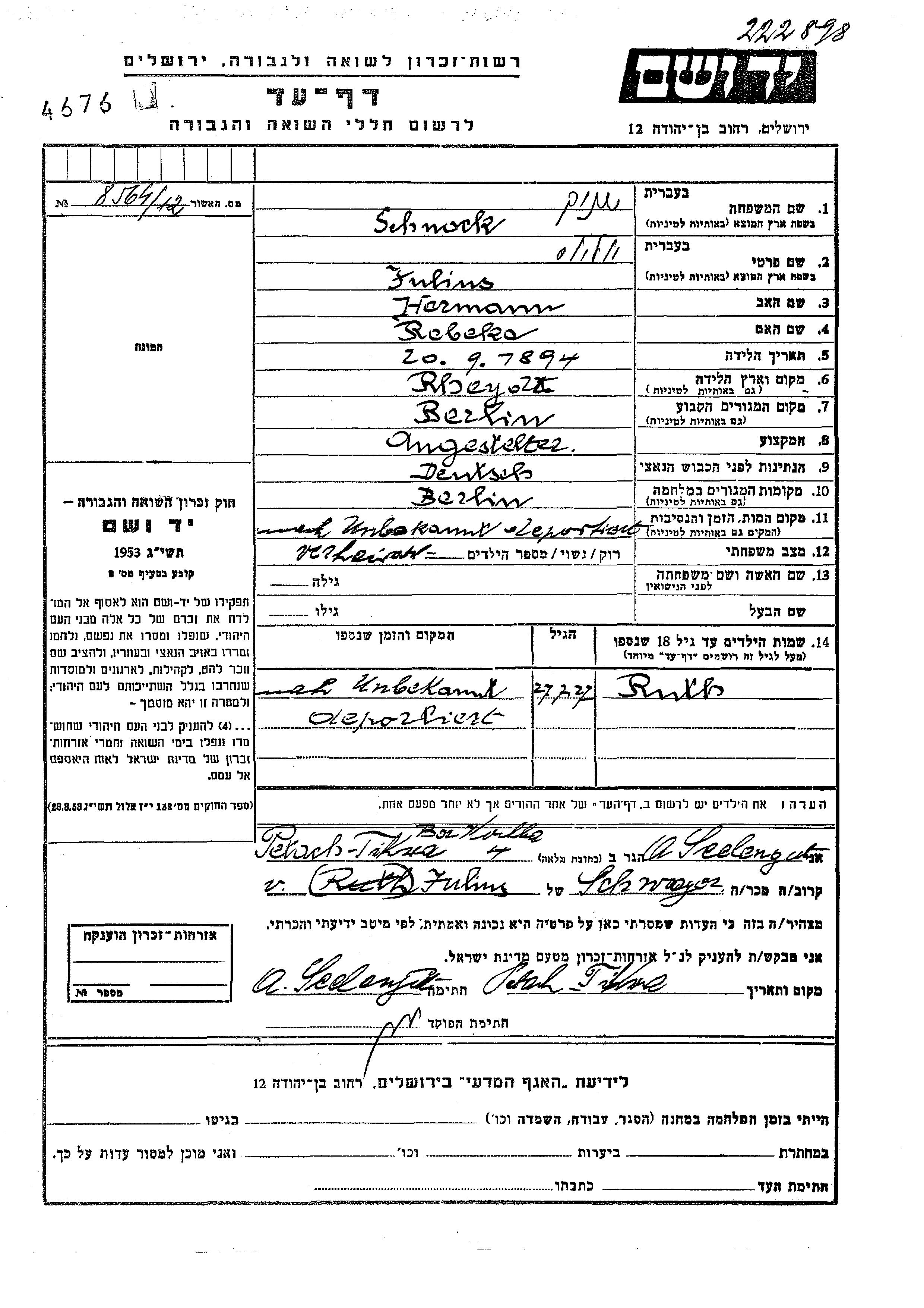 Julius Schnock wurde im Jahr 1894 in Rheydt, Deutsches Reich geboren. Er war der Sohn von Hermann und Rebeka. Er war Angestellte/-r und Verheiratet. Vor dem Zweiten Weltkrieg lebte er in Berlin, Deutsches Reich. Während des Krieges war er in Berlin, Deutsches Reich.