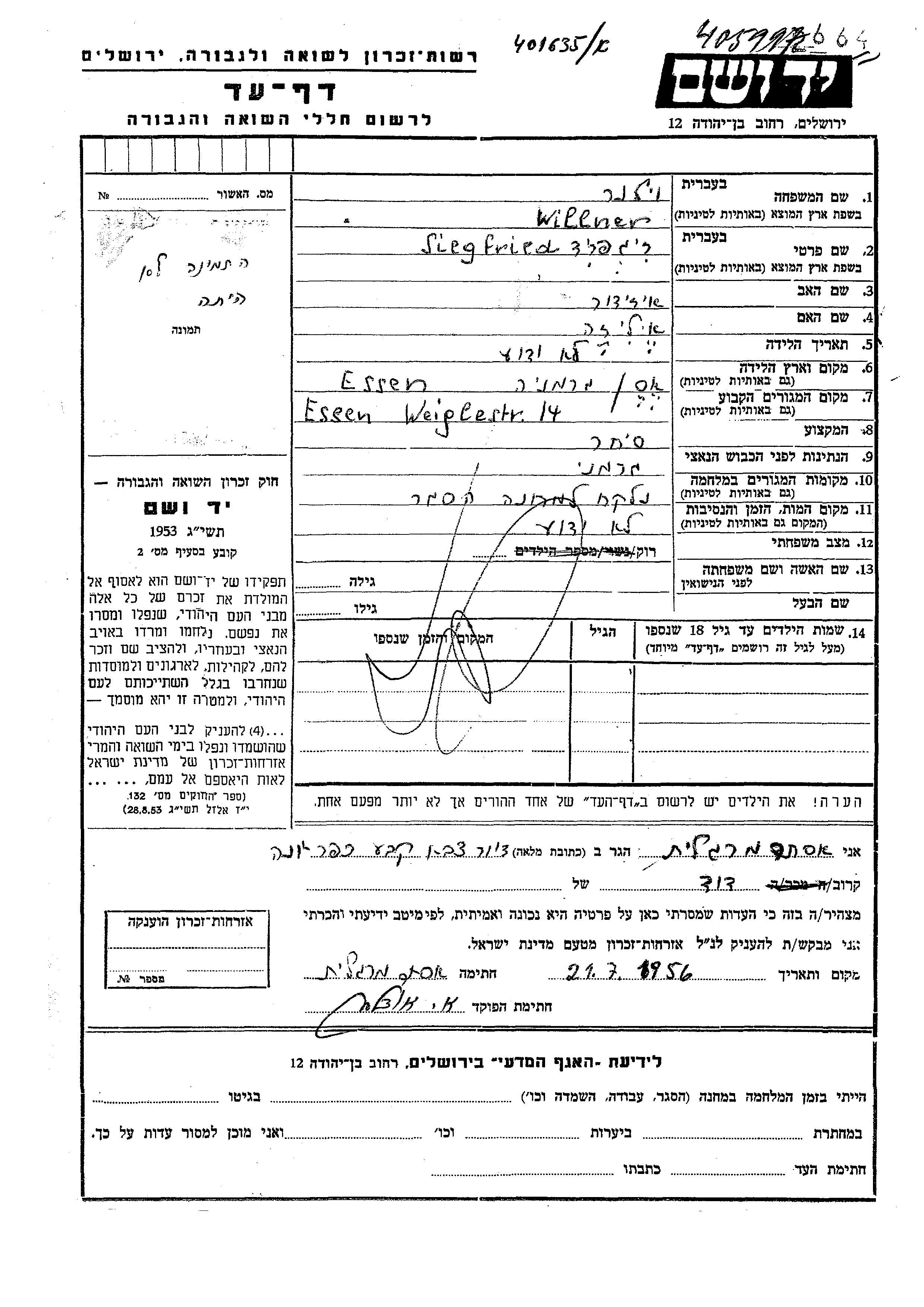 Siegfried Willner wurde in Essen, Deutsches Reich geboren. Er war der Sohn von Izidor und Eliza. Er war Kaufmann/-frau und Ledig. Vor dem Zweiten Weltkrieg lebte er in Essen, Deutsches Reich.