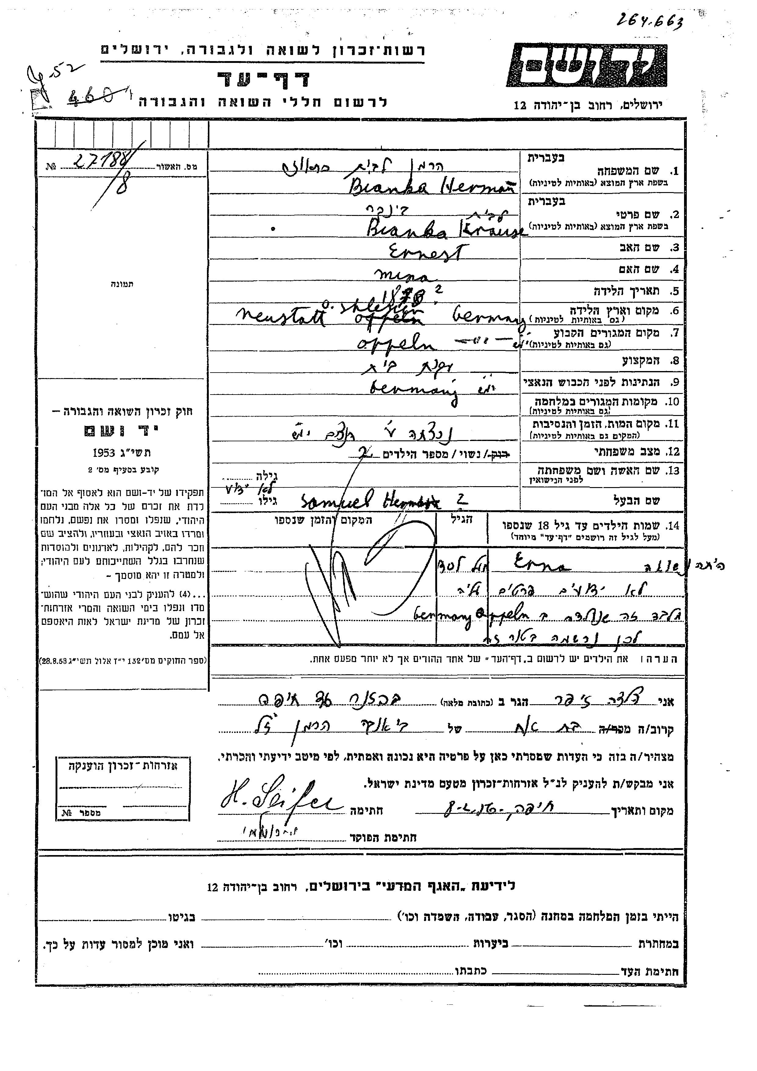 Binka Herman, geb. Krause wurde im Jahr 1878 in Neustadt, Deutsches Reich geboren. Sie war die Tochter von Ernest und Mina. Sie war Hausfrau und mit Samuel Verheiratet. Vor dem Zweiten Weltkrieg lebte sie in Oppeln, Deutsches Reich.