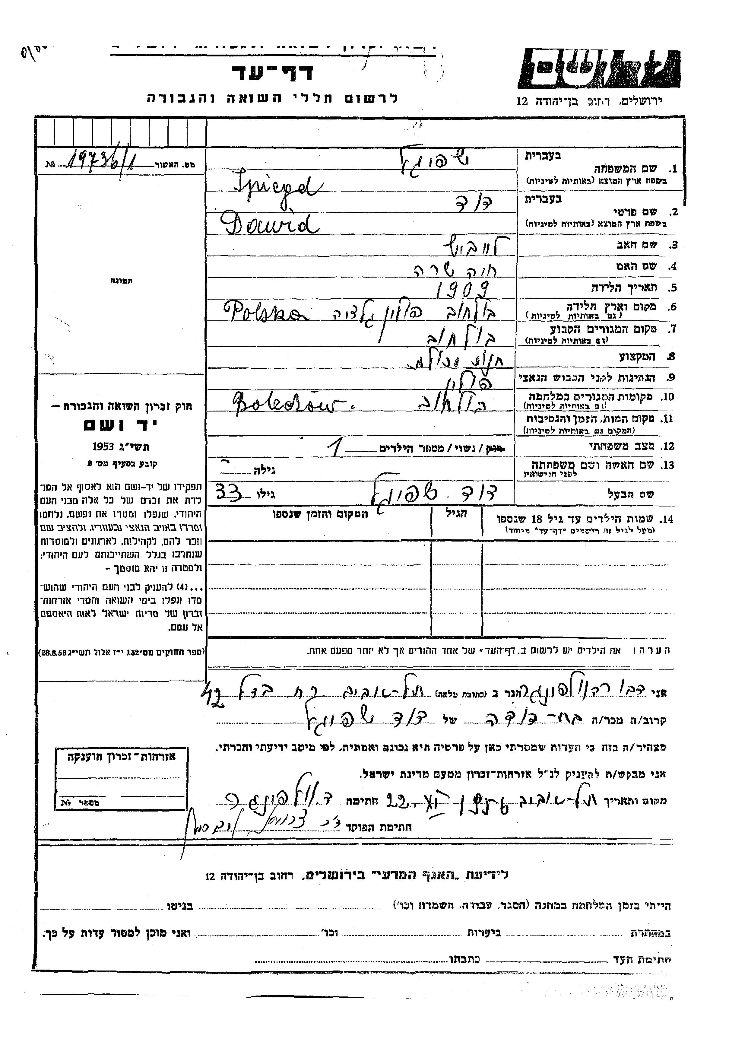 Dawid Spiegel wurde im Jahr 1909 in Bolechow, Polen geboren. Er war der Sohn von Leibish und Khaia Sara. Er war Verheiratet. Vor dem Zweiten Weltkrieg lebte er in Bolechow, Polen. Während des Krieges war er in Bolechow, Polen.