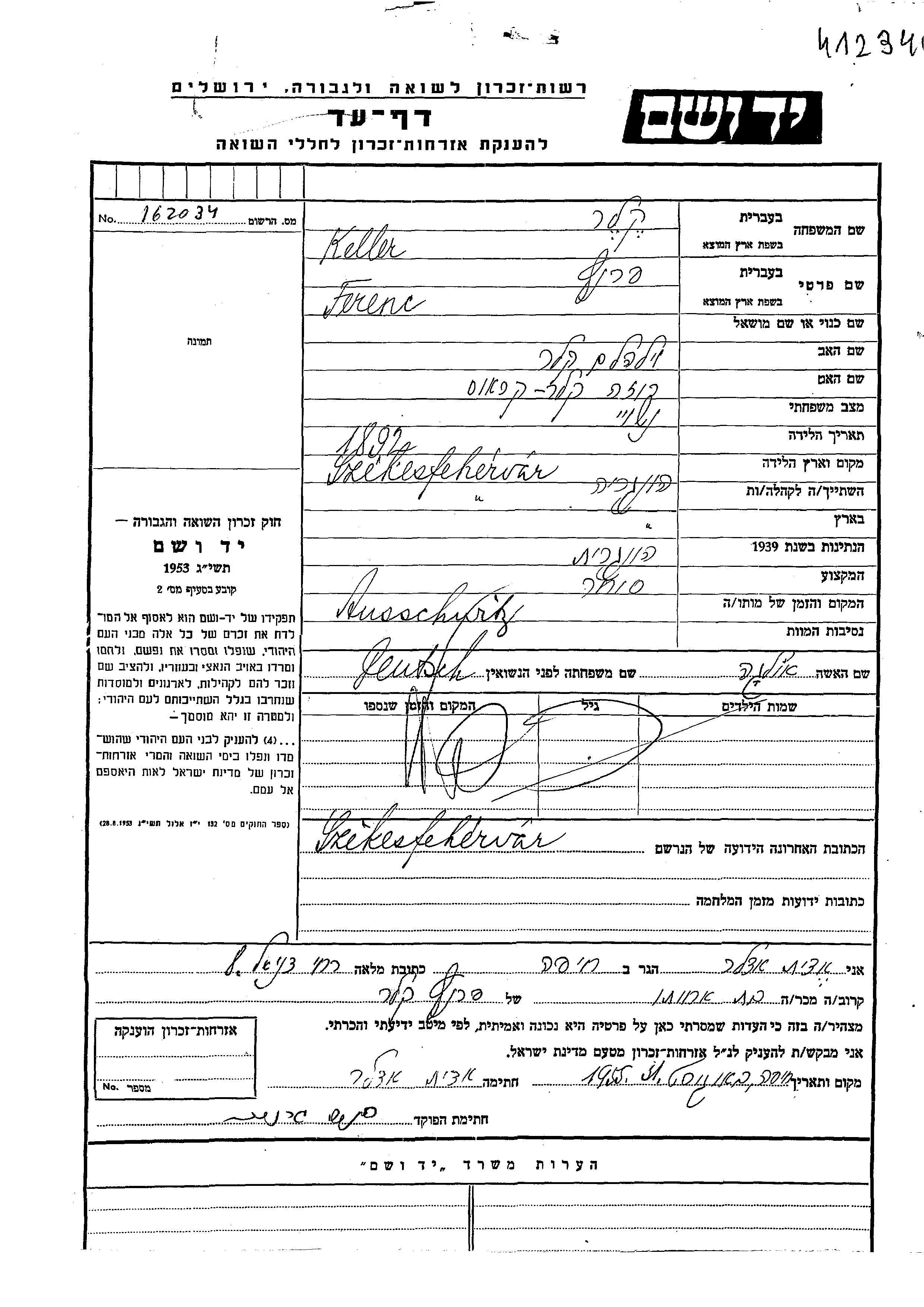 Ferentz Keller wurde im Jahr 1892 in Szekesfehervar, Ungarn geboren. Er war der Sohn von Vilhelm und Roza. Er war Kaufmann/-frau und mit Olga, geb. Deutsch Verheiratet. Vor dem Zweiten Weltkrieg lebte er in Szekesfehervar, Ungarn. Während des Krieges war er in Szekesfehervar, Ungarn.