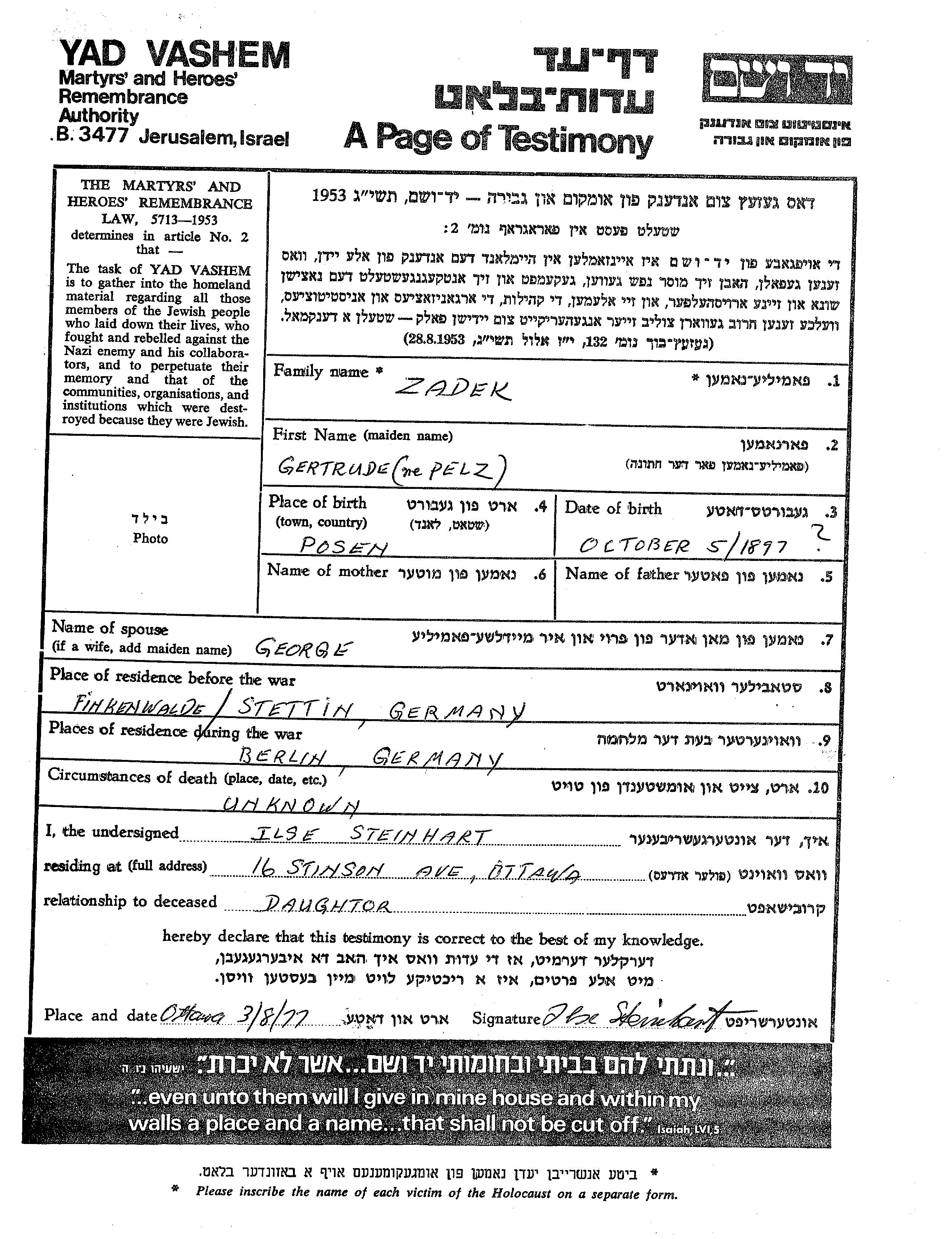 Gertrude Zadek, geb. Pelz wurde im Jahr 1897 in Posen, Polen geboren. Sie war mit George Verheiratet. Vor dem Zweiten Weltkrieg lebte sie in Finkenwalde, Deutsches Reich. Während des Krieges war sie in Berlin, Deutsches Reich.