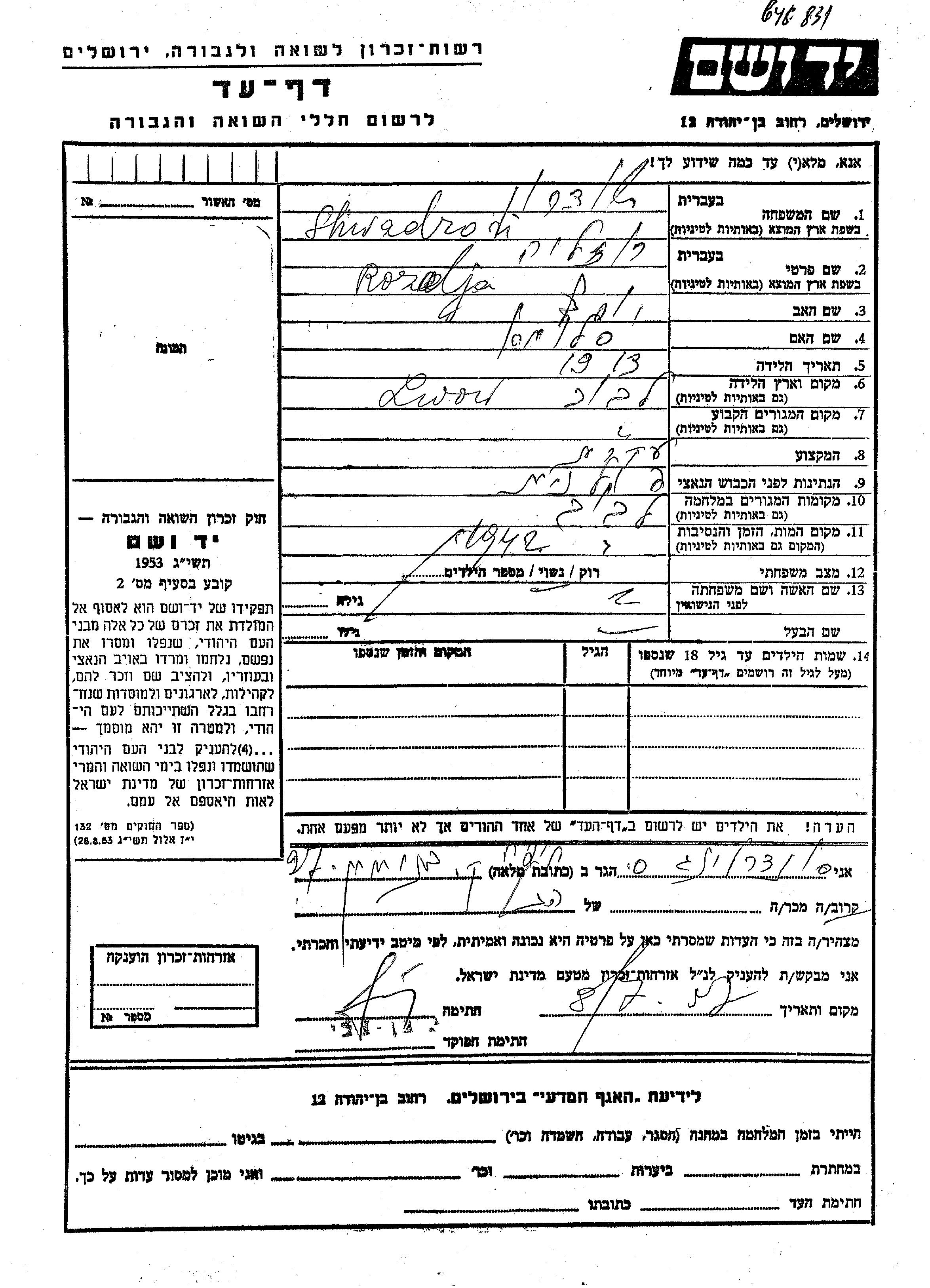 Rozalja Shwadron wurde im Jahr 1913 in Lwow, Polen geboren. Sie war die Tochter von Yosef und Shulamit. Sie war Hausfrau und Verheiratet. Vor dem Zweiten Weltkrieg lebte sie in Lwow, Polen. Während des Krieges war sie in Lwow, Polen.