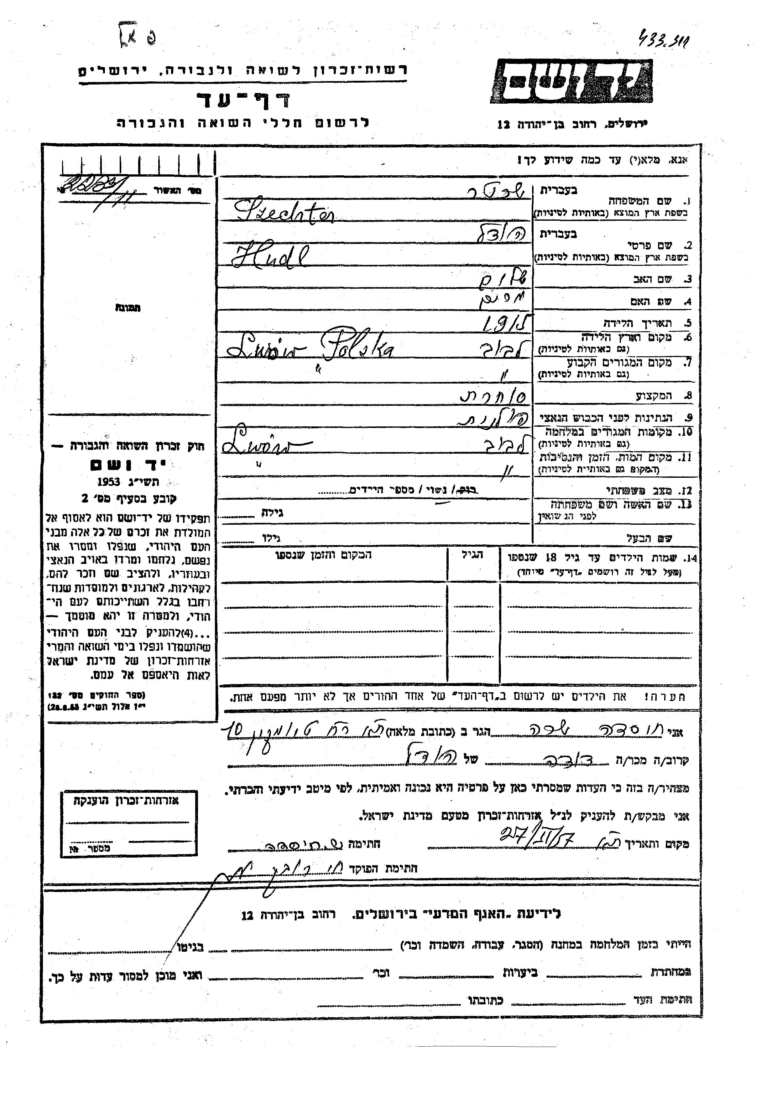 Hudl Szechter wurde im Jahr 1915 in Lwow, Polen geboren. Sie war die Tochter von Shalom und Miriam. Sie war Kaufmann/-frau und Verheiratet. Vor dem Zweiten Weltkrieg lebte sie in Lwow, Polen. Während des Krieges war sie in Lwow, Polen.