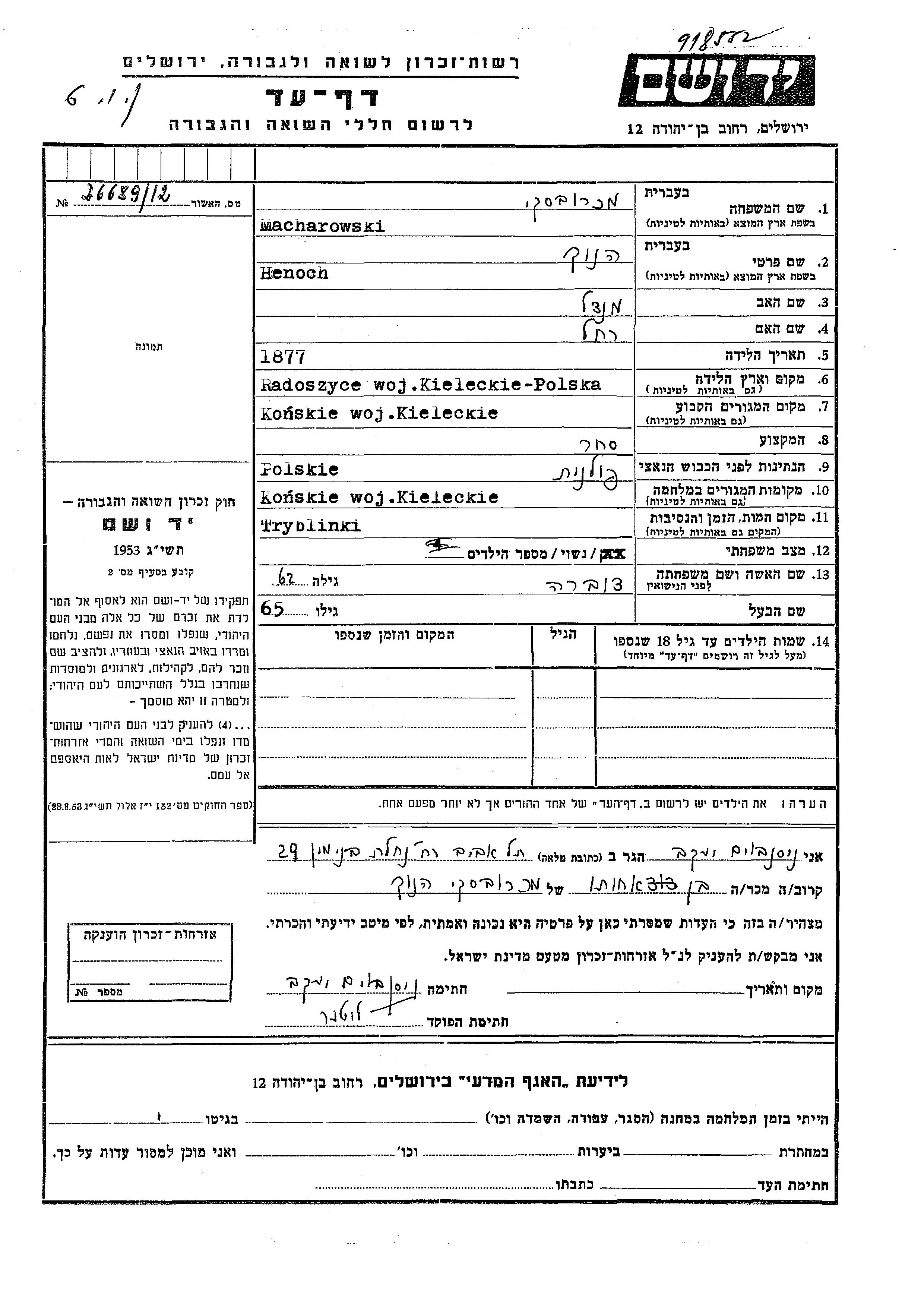 Henoch Macharowski wurde im Jahr 1877 in Radoszyce, Polen geboren. Er war der Sohn von Mendel und Rakhel. Er war Kaufmann/-frau und mit Dobra Verheiratet. Vor dem Zweiten Weltkrieg lebte er in Konskie, Polen. Während des Krieges war er in Konskie, Polen.