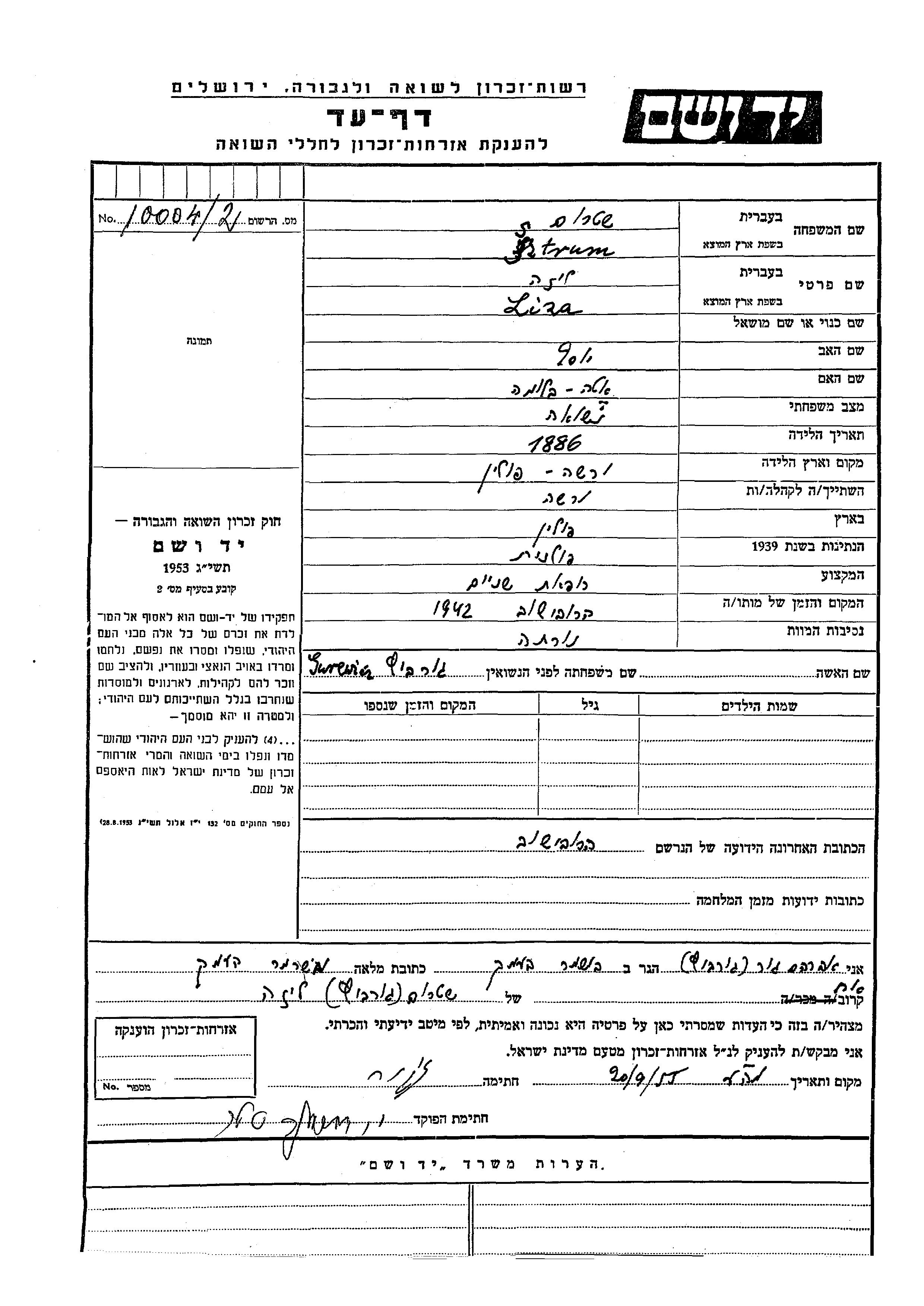 Liza Strum Shtrum wurde im Jahr 1886 in Warsaw, Polen geboren. Sie war die Tochter von Yosef und Eta Bluma. Sie war Zahnarzt/-ärztin und Verheiratet. Vor dem Zweiten Weltkrieg lebte sie in Warszawa, Polen. Während des Krieges war sie in Chrubieszow, Polen.