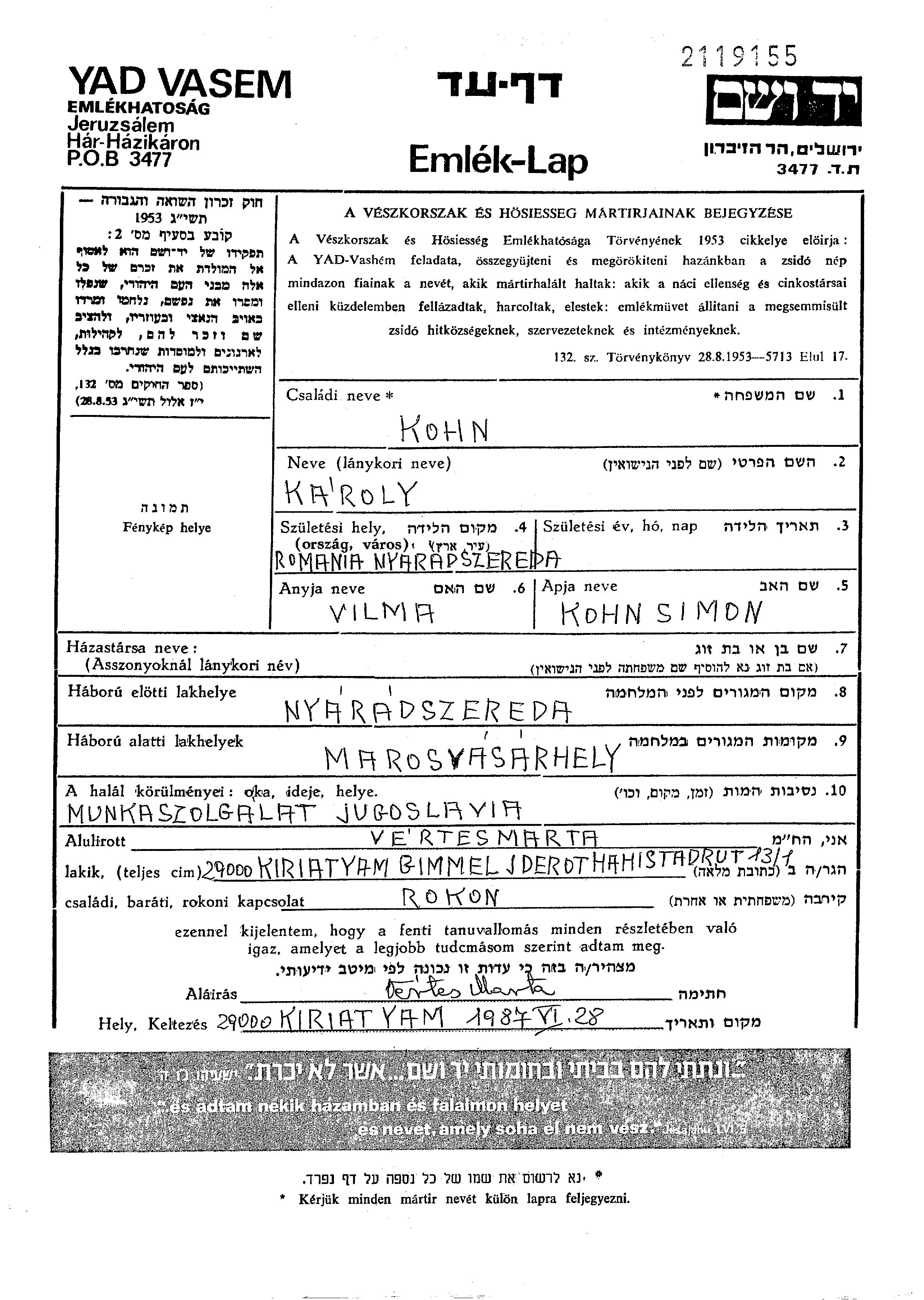 Kohn Karoly Nyaradszereda, Rumänien Gedenkblatt