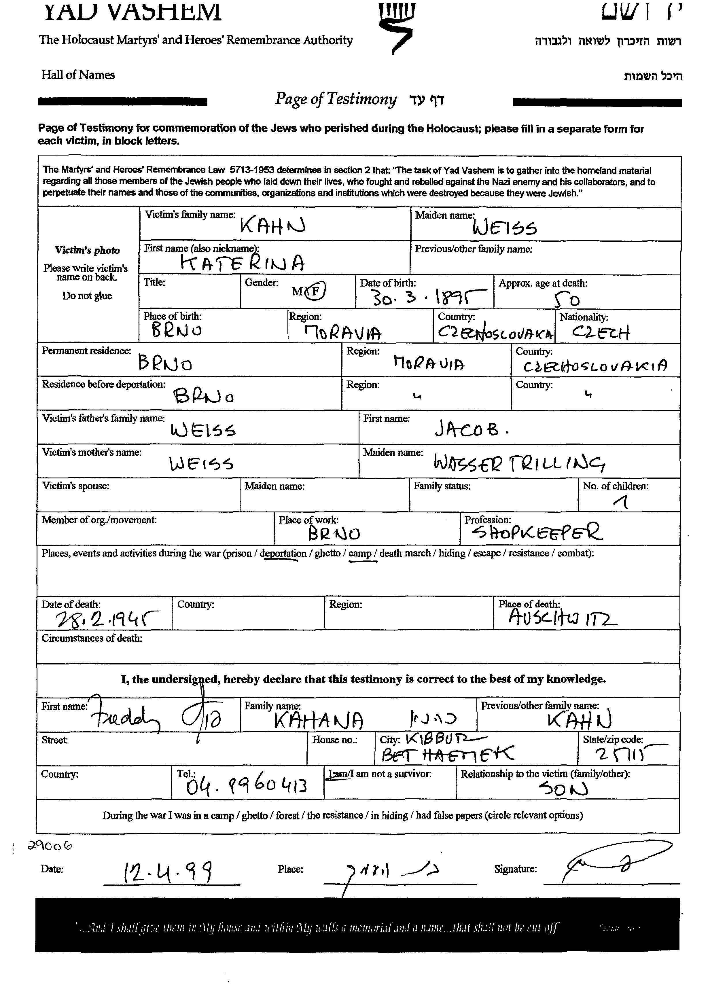 Katerina Weiss, geb. Kahn wurde im Jahr 1895 in Brno, Tschechoslowakei geboren. Sie war die Tochter von Jacob, geb. Wassertrilling. Sie war Ladenbesitzer/-in und Verheiratet. Vor dem Zweiten Weltkrieg lebte sie in Brno, Tschechoslowakei. Während des Krieges war sie in Brno, Tschechoslowakei.
