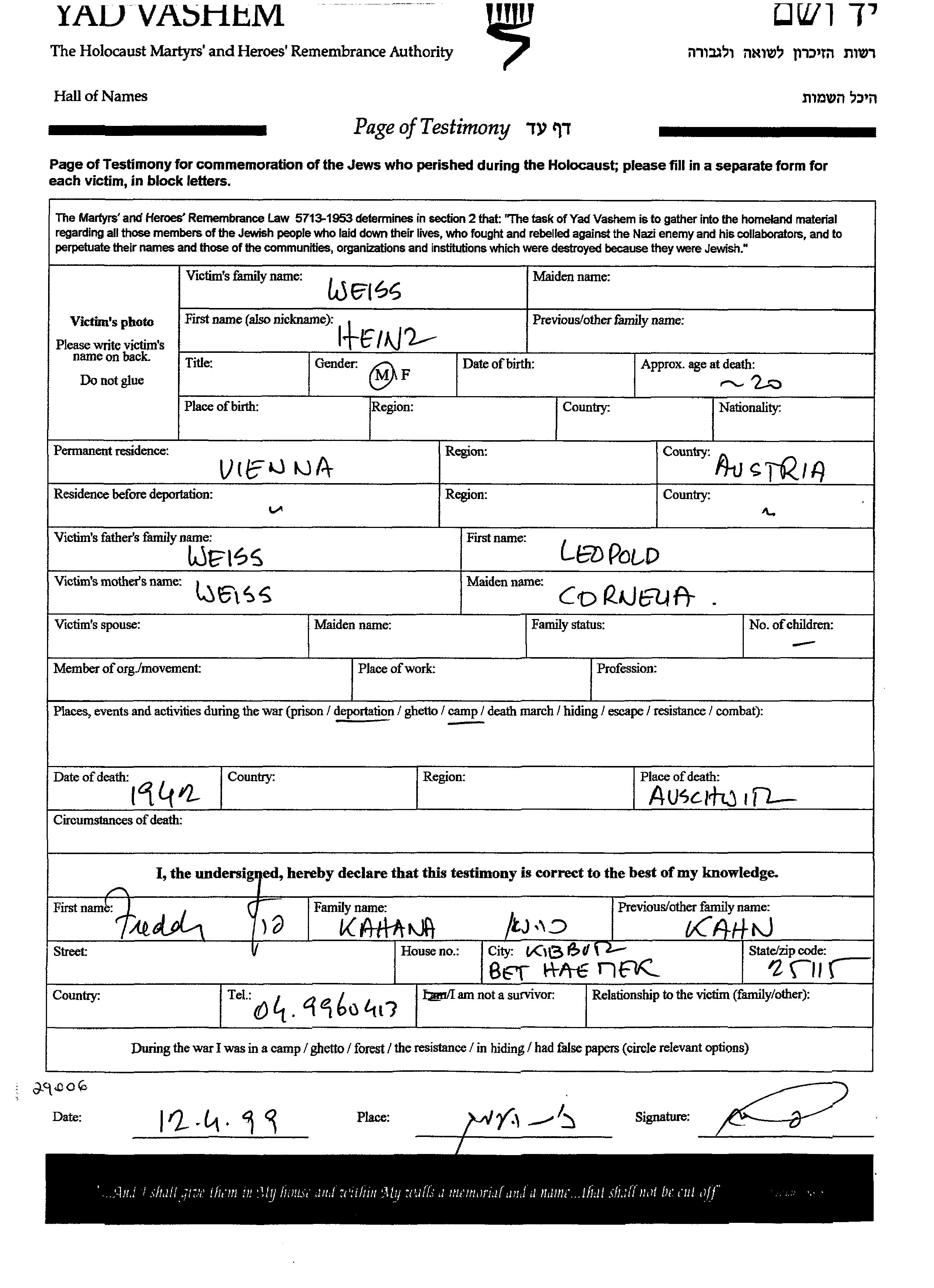 Heinz Weiss wurde Er war der Sohn von Leopold und Cornelia. Er war Ledig. Vor dem Zweiten Weltkrieg lebte er in Vienna, Österreich. Während des Krieges war er in Vienna, Österreich.