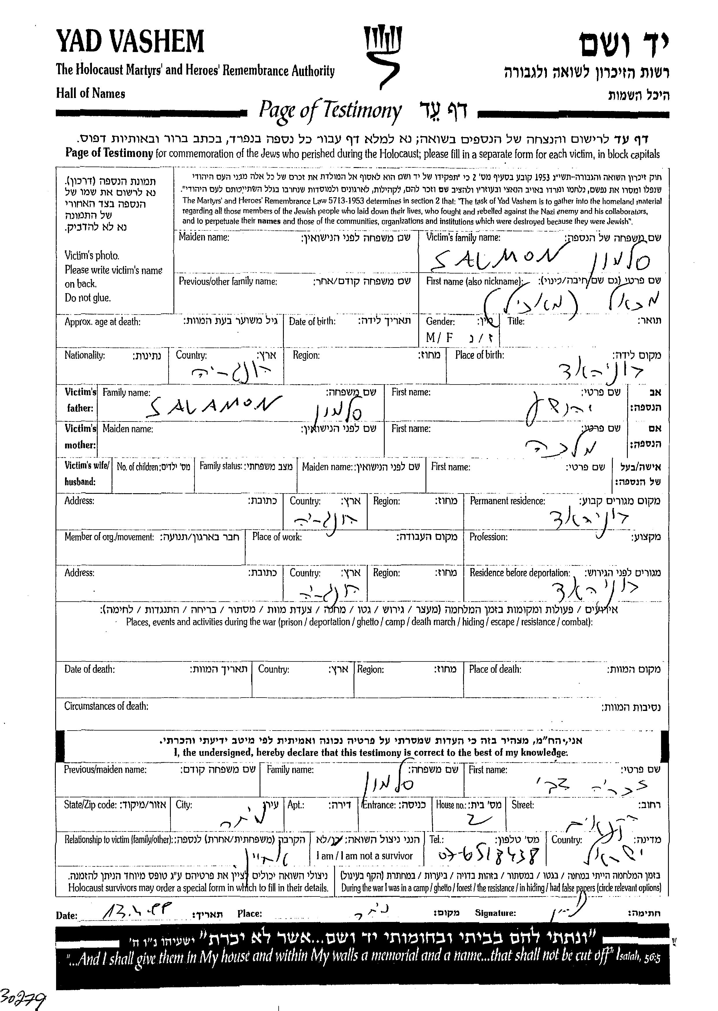 Mekhael Salamon Salmon wurde in Bonyhad, Ungarn geboren. Er war der Sohn von Yehoshua und Malka. Vor dem Zweiten Weltkrieg lebte er in Bonyhad, Ungarn. Während des Krieges war er in Bonyhad, Ungarn.