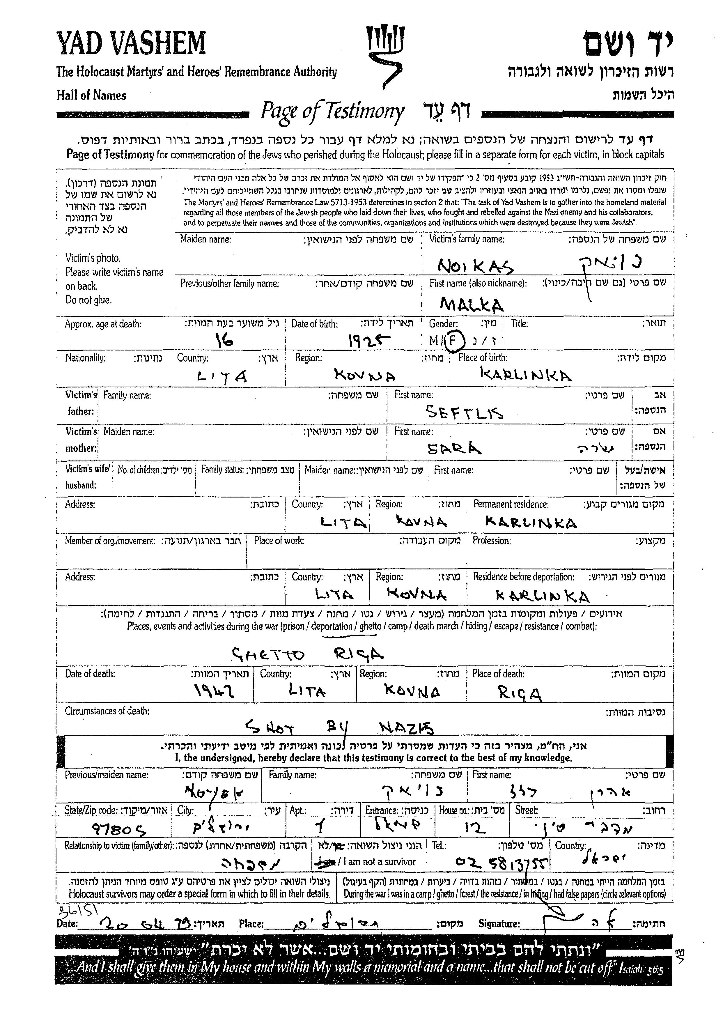 Malka Noikas wurde im Jahr 1925 in Kowno, Litauen geboren. Sie war die Tochter von Seftlis und Sara. Sie war Ledig. Vor dem Zweiten Weltkrieg lebte sie in Kowno, Litauen. Während des Krieges war sie in Kowno, Litauen.