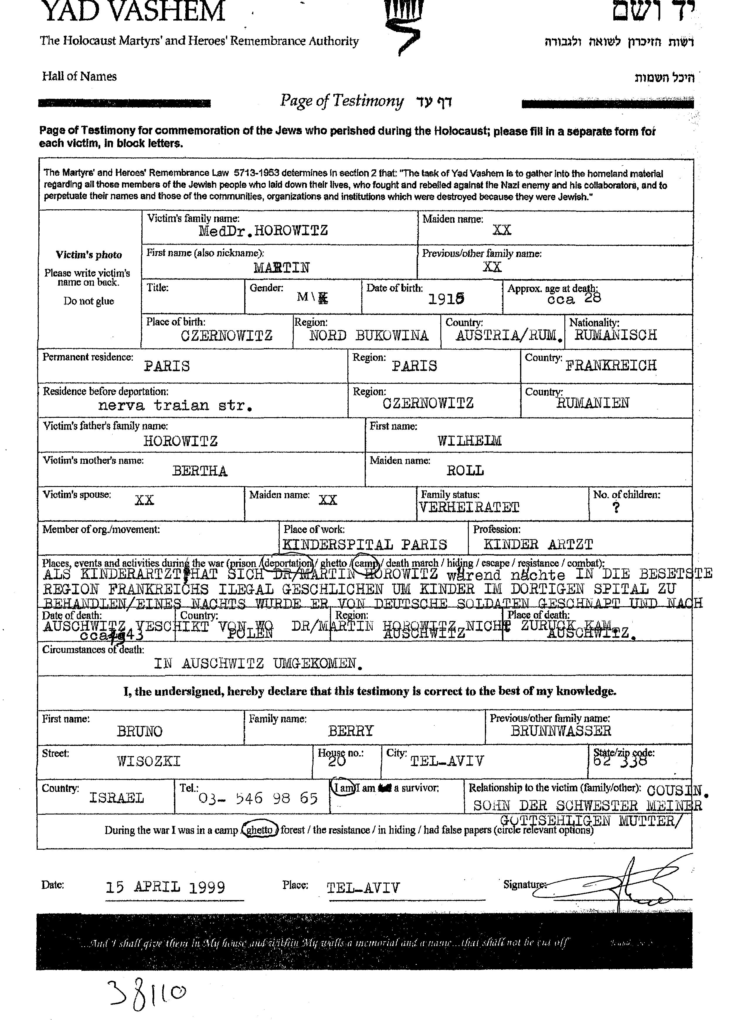 Dr. Horowitz wurde in der Schoah ermordet. Todesort: Auschwitz, Polen im Jahr 1943.