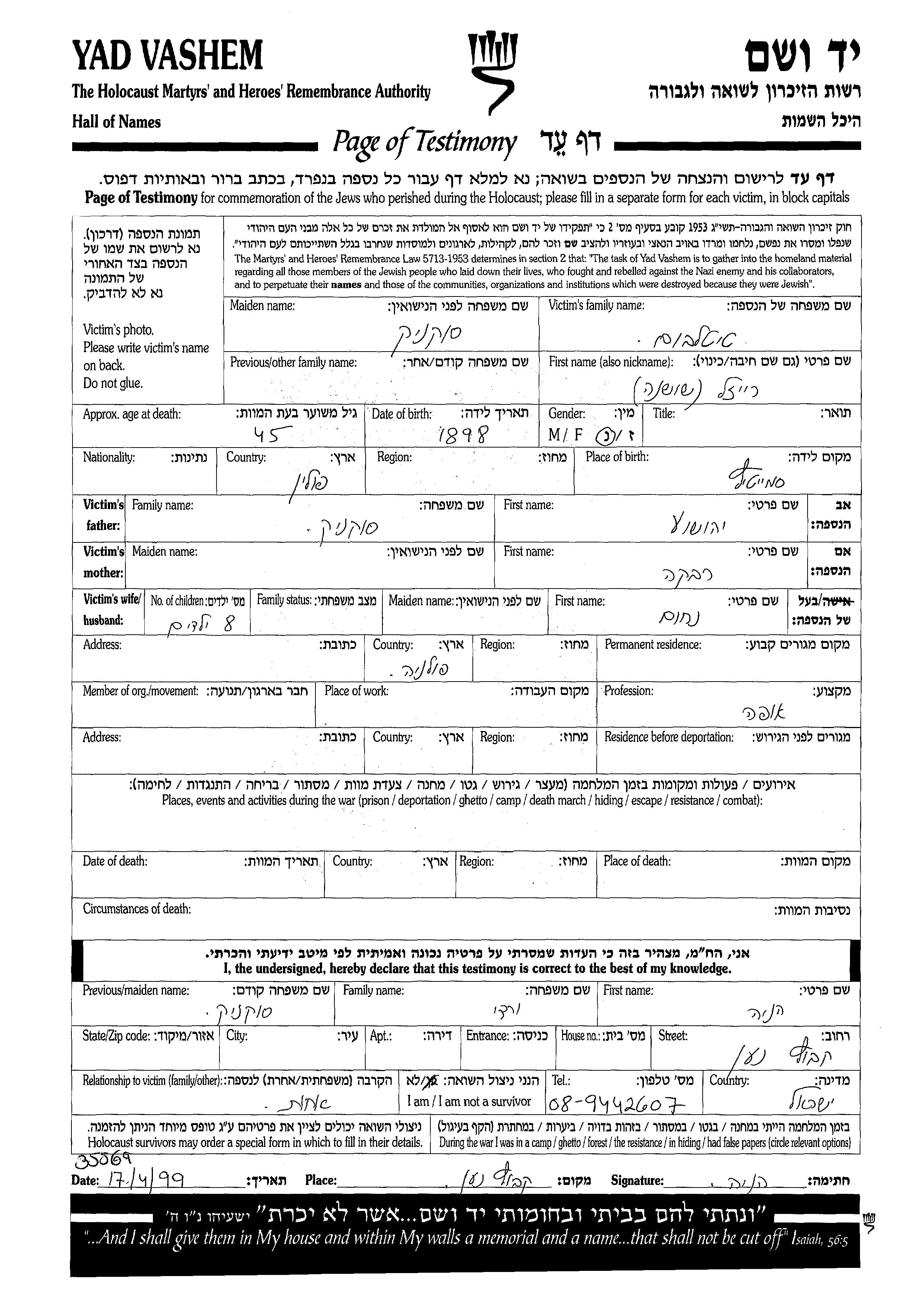 Reizl Shoshana Teitelbaum, geb. Sukenik wurde im Jahr 1898 in Semiatycze, Polen geboren. Sie war die Tochter von Yehoshua und Rivka. Sie war Bäcker/-in und mit Nakhum Verheiratet. Vor dem Zweiten Weltkrieg lebte sie in Polen.