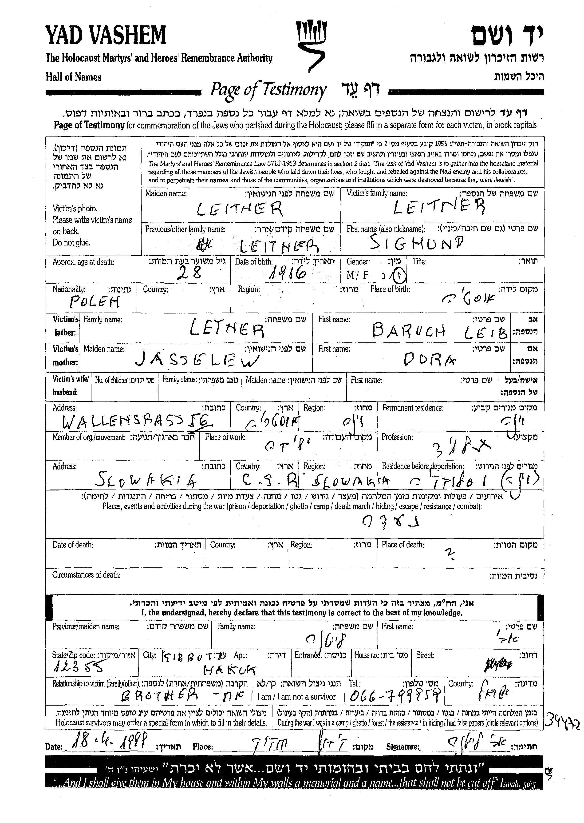 Sigmund Leitner wurde im Jahr 1916 in Österreich geboren. Er war der Sohn von Baruch und Dora, geb. Jasselew. Er war Student und Ledig. Vor dem Zweiten Weltkrieg lebte er in Wienna, Österreich. Während des Krieges war er in Slovakia, Tschechoslowakei.